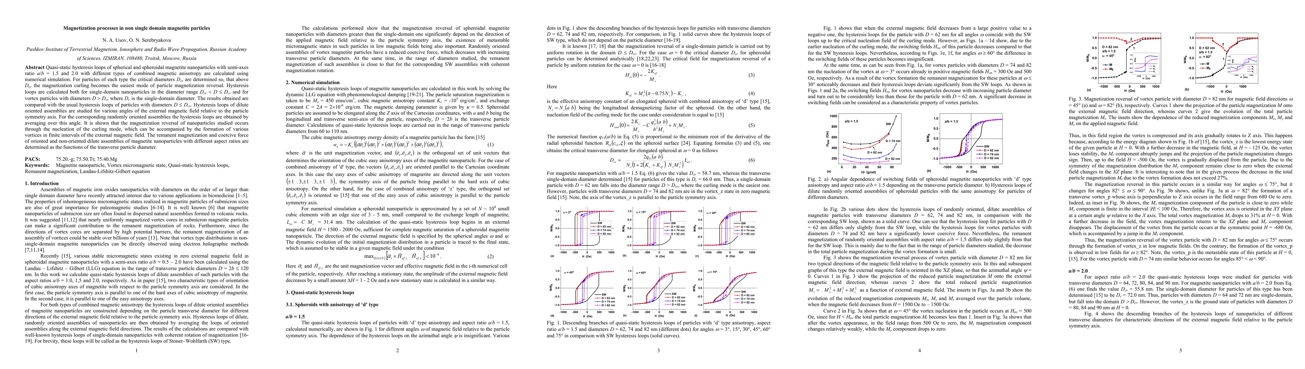 This paper investigates magnetization processes in non-single domain magnetite nanoparticles, using numerical simulations to calculate quasi-static hysteresis loops for different shapes and sizes. It identifies critical diameters above which curling becomes the primary magnetization reversal mode, and examines the hysteresis behavior for both single-domain and vortex particles.