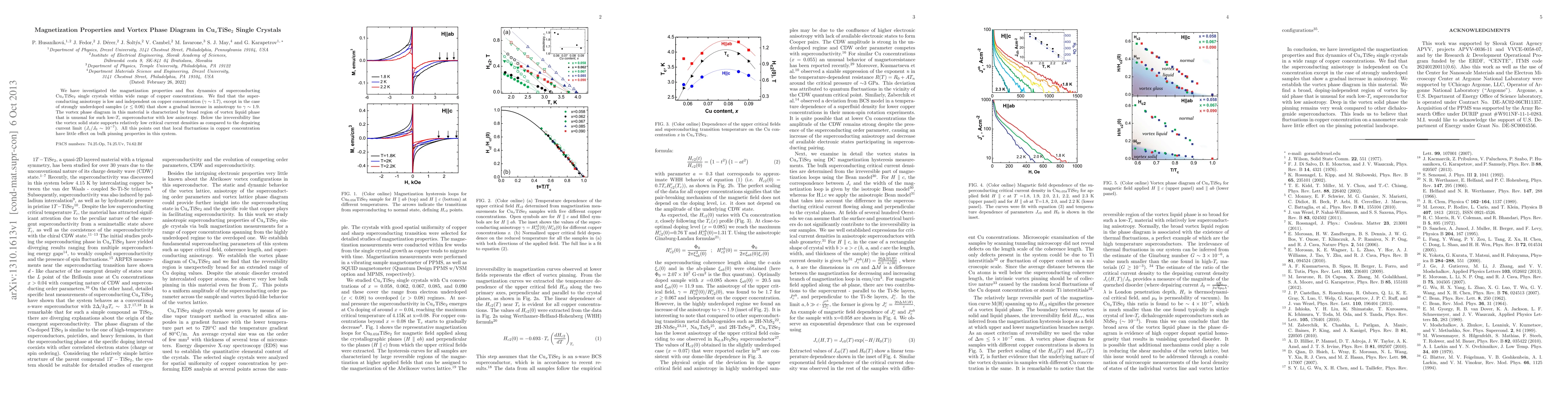 This study investigates the magnetization properties and vortex phase diagram of Cu$_x$TiSe$_2$ single crystals, revealing low superconducting anisotropy ($\gamma\sim1.7$) unaffected by copper concentration, except for underdoped samples. The vortex phase diagram features a broad vortex liquid phase, unusual for low-$T_c$ superconductors, with low critical current densities below the irreversibility line.