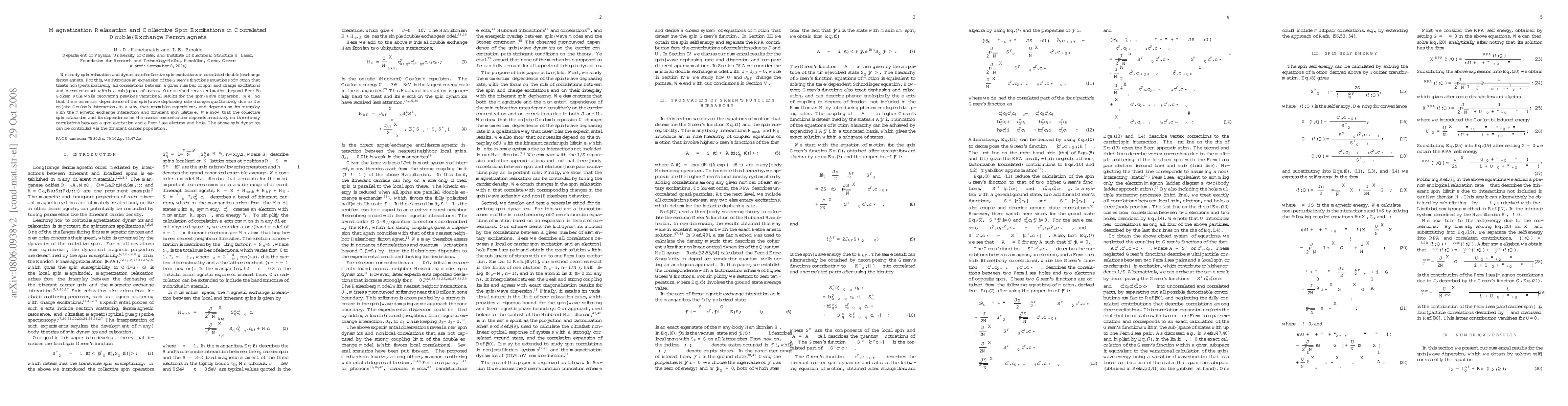 We study spin relaxation and dynamics of collective spin excitations in correlated double--exchange ferromagnets. For this, we introduce an expansion of the Green's functions equations of motion that treats non--perturbativerly all correlations between a given number of spin and charge excitations and becomes exact within a sub--space of states. Our method treats relaxation beyond Fermi's Golden Rule while recovering previous variational results for the spin--wave dispersion. We find that the momentum dependence of the spin--wave dephasing rate changes qualitatively due to the on--site Coulomb interaction, in a way that resembles experiment, and depends on its interplay with the magnetic exchange interaction and itinerant spin lifetime. We show that the collective spin relaxation and its dependence on the carrier concentration depends sensitively on three--body correlations between a spin excitation and a Fermi sea electron and hole. The above spin dynamics can be controlled via the itinerant carrier population.