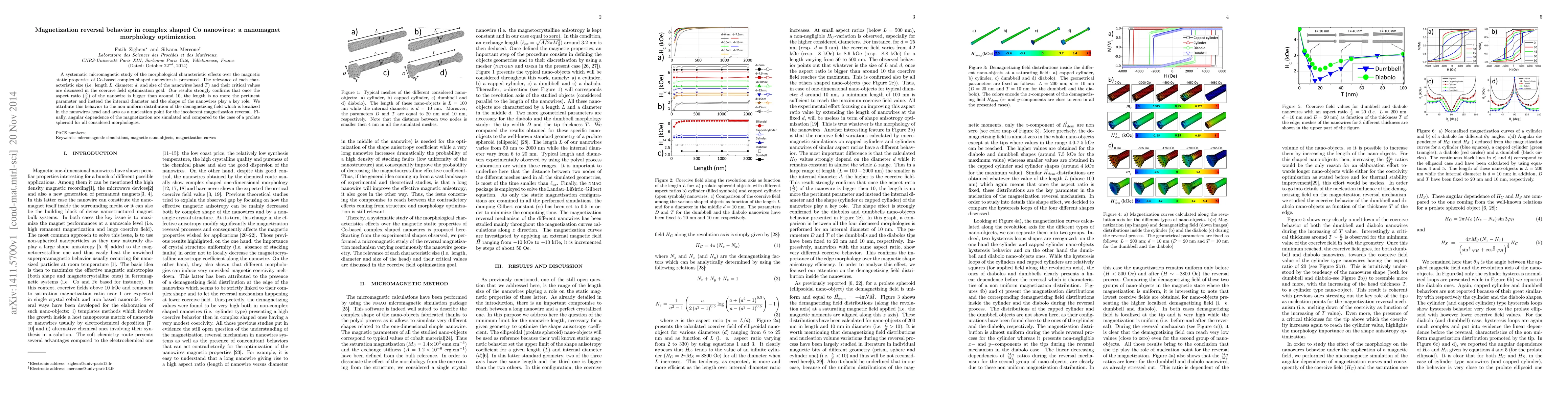 A systematic micromagnetic study of the morphological characteristic effects over the magnetic static properties of Co-based complex shaped nanowires is presented. The relevance of each characteristic size (i.e. length L, diameter d, and size of the nanowires head T) and their critical values are discussed in the coercive field optimization goal. Our results strongly confirms that once the aspect ratio (L/d) of the nanowire is bigger than around 10, the length is no more the pertinent parameter and instead the internal diameter and the shape of the nanowires play a key role. We attribute this behavior to the non uniform distribution of the demagnetizing field which is localized in the nanowires head and acts as a nucleation point for the incoherent magnetization reversal. Finally, angular dependence of the magnetization are simulated and compared to the case of a prolate spheroid for all considered morphologies.