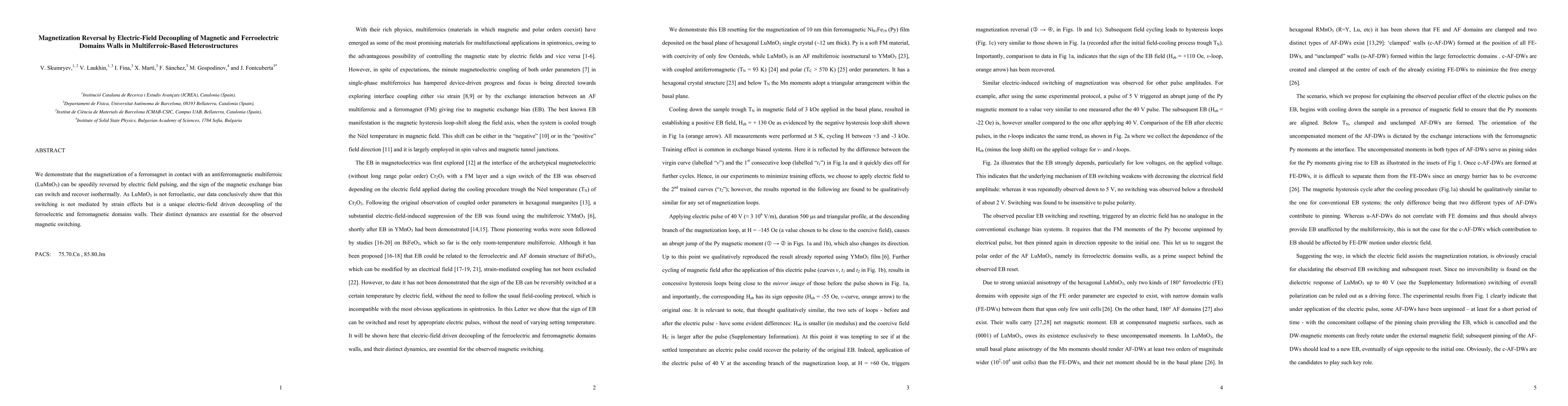 This research demonstrates that magnetization reversal in a ferromagnet adjacent to an antiferromagnetic multiferroic (LuMnO3) can be achieved via electric field pulsing, with the magnetic exchange bias switching and recovering isothermally. This effect is due to electric-field-induced decoupling of magnetic and ferroelectric domain walls, not strain, highlighting unique electric-field driven domain wall dynamics.
