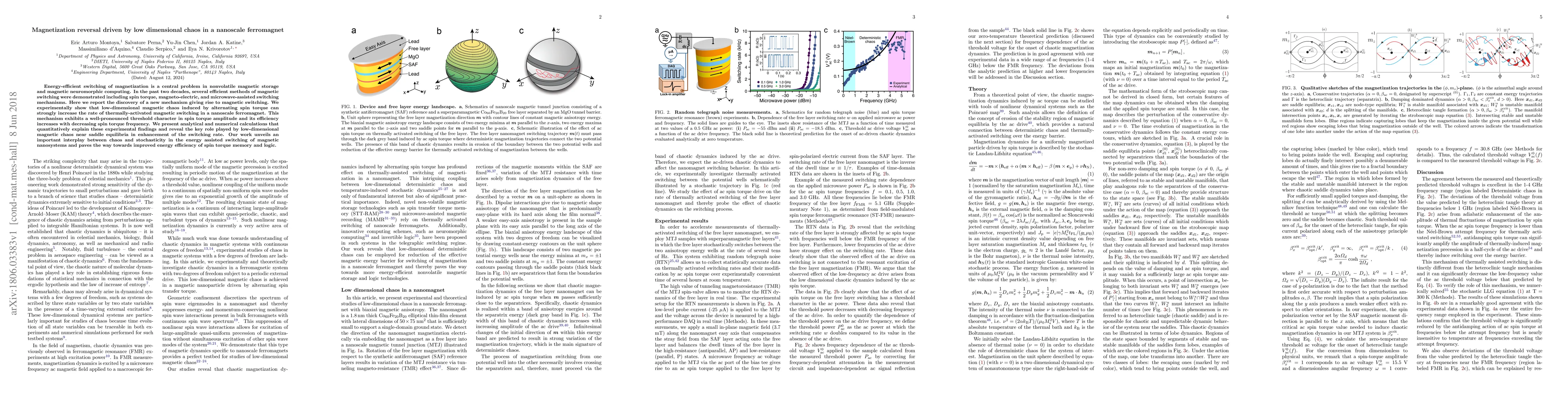 This paper reports a novel mechanism for energy-efficient magnetization reversal in nanoscale ferromagnets, driven by low-dimensional magnetic chaos induced by alternating spin torque. The study demonstrates that chaos significantly enhances thermally-activated switching, with efficiency increasing at lower spin torque frequencies, revealing a potential pathway for improved energy efficiency in magnetic memory and logic devices.