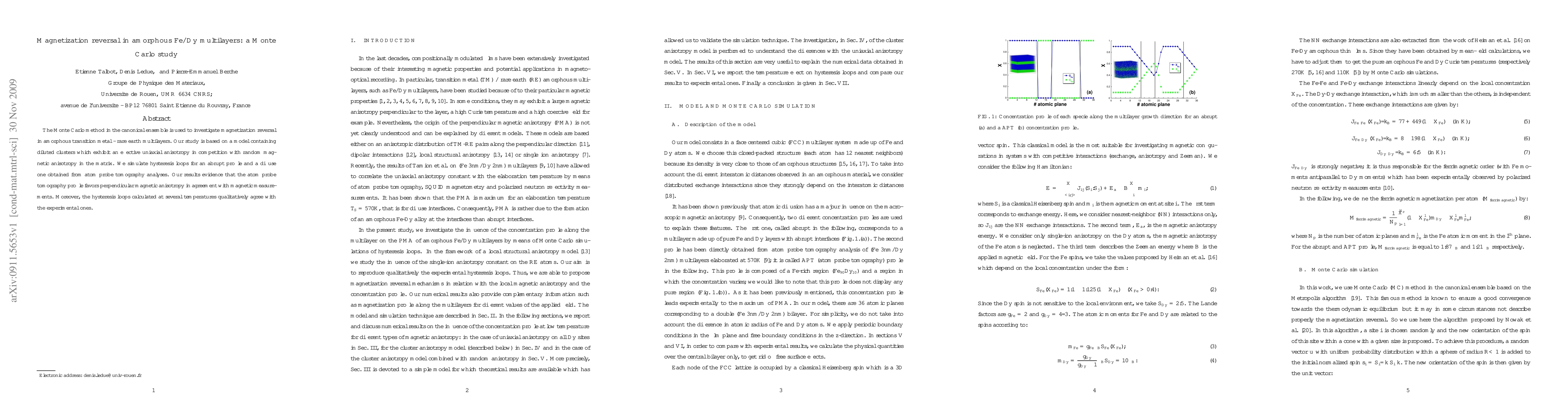 This study uses Monte Carlo simulations to explore magnetization reversal in amorphous Fe/Dy multilayers, focusing on the interplay between uniaxial and random magnetic anisotropies. The simulations reveal that a diffuse profile, derived from atom probe tomography, aligns with experimental observations of perpendicular magnetic anisotropy and matches the temperature-dependent hysteresis loops observed in experiments.