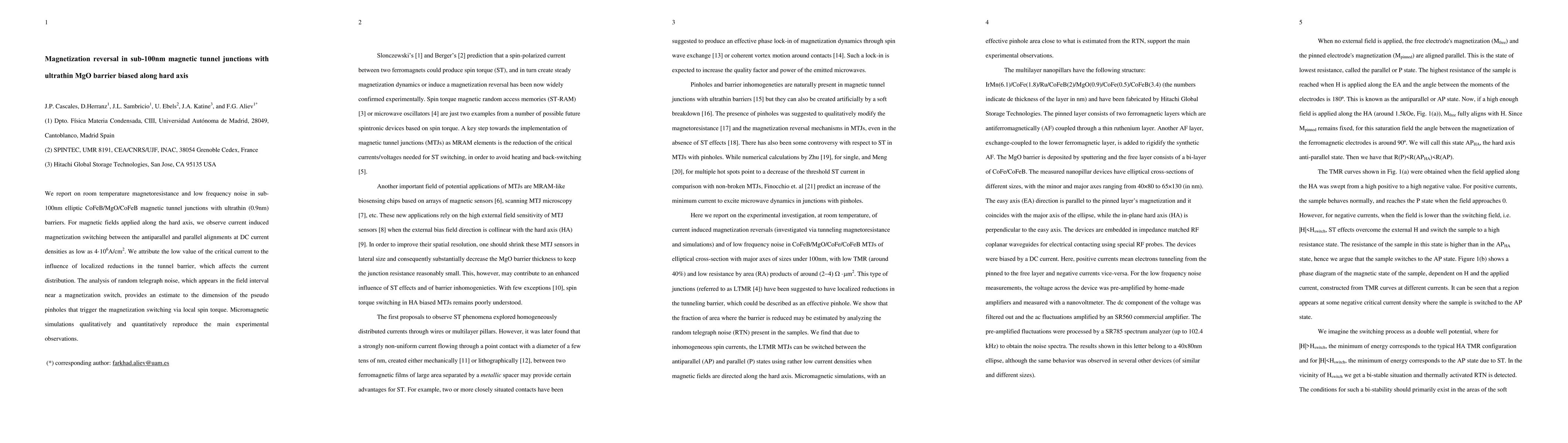 This paper investigates the magnetization reversal in sub-100nm magnetic tunnel junctions with ultrathin MgO barriers, observing current-induced switching at low DC current densities. The study reveals the influence of localized barrier reductions and pseudo pinholes on the switching process, supported by micromagnetic simulations.