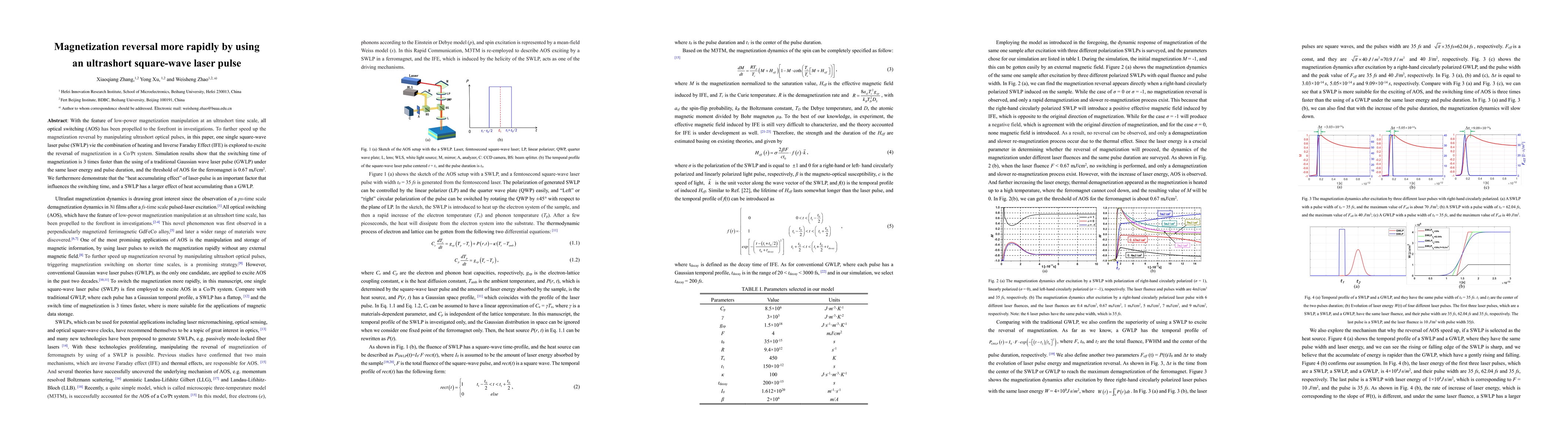 This paper explores the use of an ultrashort square-wave laser pulse (SWLP) to accelerate magnetization reversal in a Co/Pt system, achieving a three-fold faster switching time compared to a traditional Gaussian wave laser pulse (GWLP) under the same conditions. The study highlights the "heat accumulating effect" as a significant factor, with SWLPs demonstrating a superior effect.