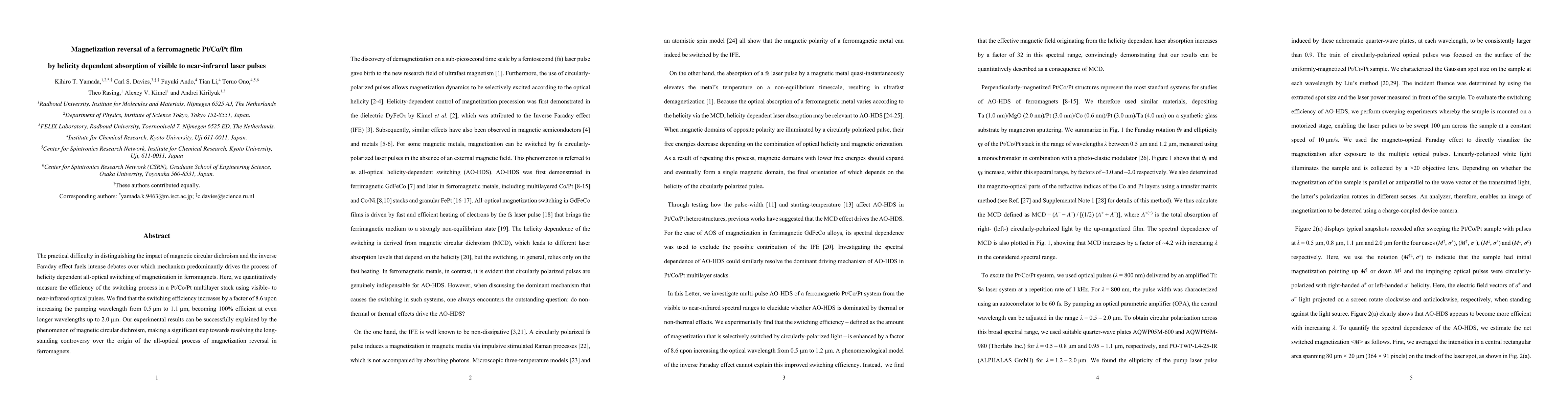 This study investigates the helicity-dependent magnetization reversal in a Pt/Co/Pt film using visible to near-infrared laser pulses, finding that switching efficiency increases significantly with longer wavelengths, supporting the magnetic circular dichroism mechanism over the inverse Faraday effect.