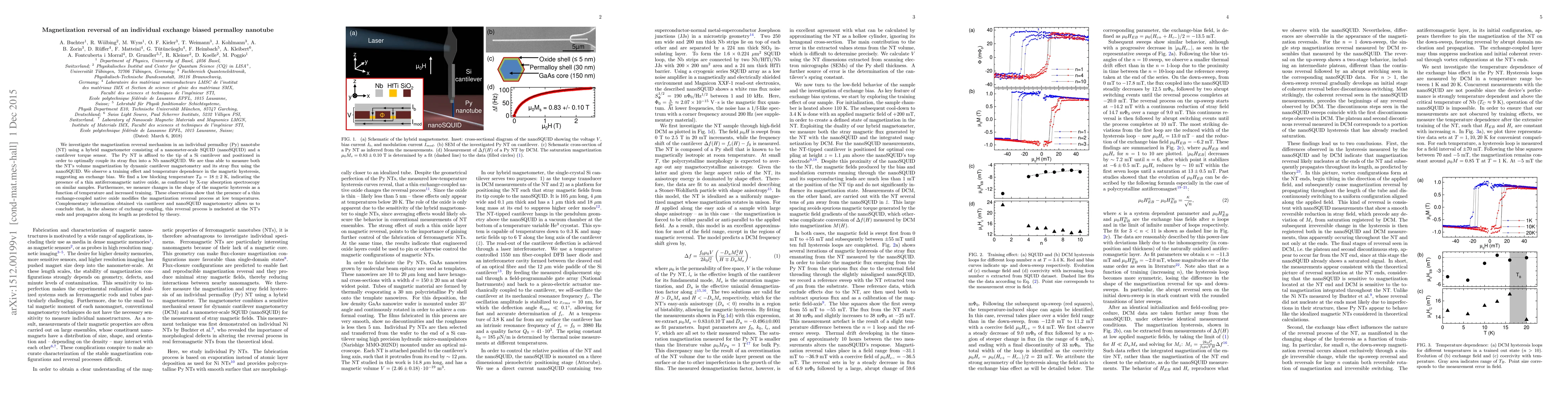 We investigate the magnetization reversal mechanism in an individual permalloy (Py) nanotube (NT) using a hybrid magnetometer consisting of a nanometer-scale SQUID (nanoSQUID) and a cantilever torque sensor. The Py NT is affixed to the tip of a Si cantilever and positioned in order to optimally couple its stray flux into a Nb nanoSQUID. We are thus able to measure both the NT's volume magnetization by dynamic cantilever magnetometry and its stray flux using the nanoSQUID. We observe a training effect and temperature dependence in the magnetic hysteresis, suggesting an exchange bias. We find a low blocking temperature $T_B = 18 \pm 2$ K, indicating the presence of a thin antiferromagnetic native oxide, as confirmed by X-ray absorption spectroscopy on similar samples. Furthermore, we measure changes in the shape of the magnetic hysteresis as a function of temperature and increased training. These observations show that the presence of a thin exchange-coupled native oxide modifies the magnetization reversal process at low temperatures. Complementary information obtained via cantilever and nanoSQUID magnetometry allows us to conclude that, in the absence of exchange coupling, this reversal process is nucleated at the NT's ends and propagates along its length as predicted by theory.