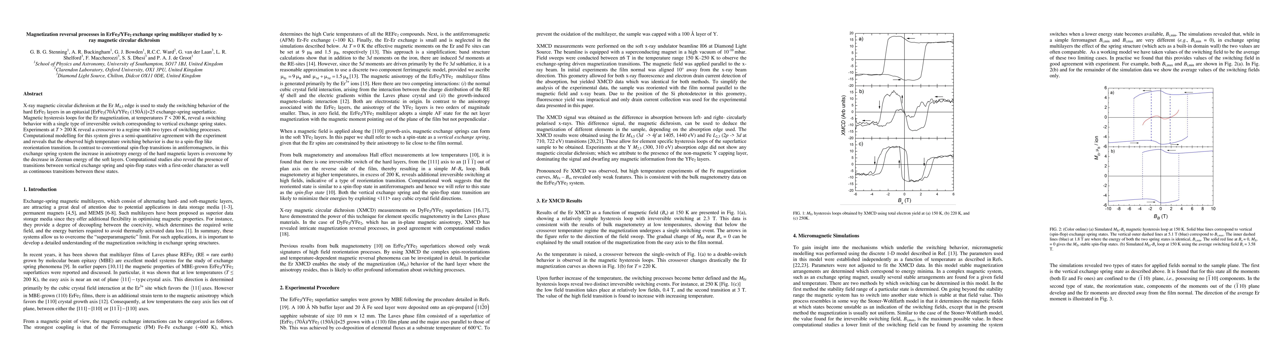 X-ray magnetic circular dichroism at the Er M4,5 edge is used to study the switching behavior of the hard ErFe2 layers in an epitaxial [ErFe2(70{\AA})/YFe2 (150{\AA})]{\times}25 exchange-spring superlattice. Magnetic hysteresis loops for the Er magnetization, at temperatures T < 200 K, reveal a switching behavior with a single type of irreversible switch corresponding to vertical exchange spring states. Experiments at T > 200 K reveal a crossover to a regime with two types of switching processes. Computational modelling for this system gives a semi-quantitative agreement with the experiment and reveals that the observed high temperature switching behavior is due to a spin-flop like reorientation transition. In contrast to conventional spin-flop transitions in antiferromagnets, in this exchange spring system the increase in anisotropy energy of the hard magnetic layers is overcome by the decrease in Zeeman energy of the soft layers. Computational studies also reveal the presence of transitions between vertical exchange spring and spin-flop states with a first-order character as well as continuous transitions between these states.