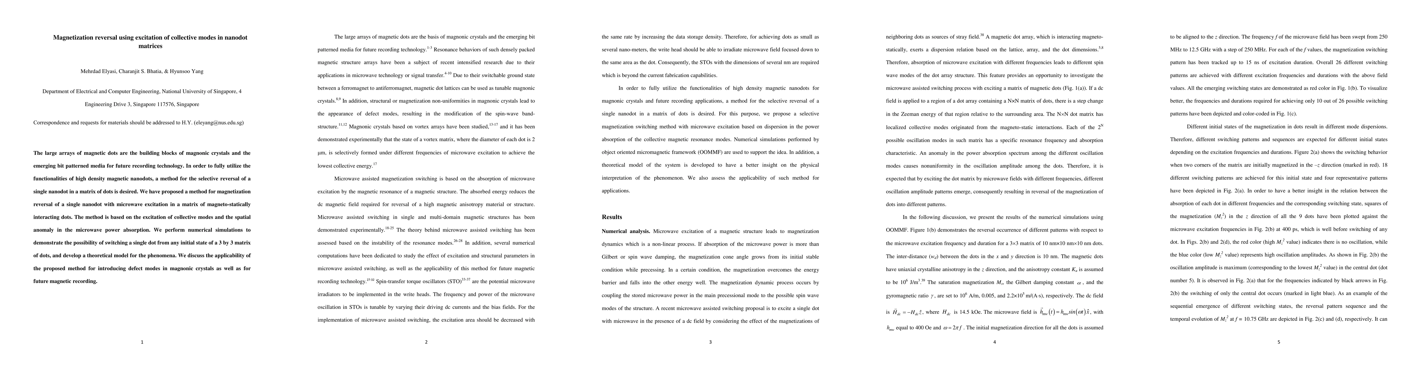 The paper presents a novel approach for selective magnetization reversal of individual nanodots in matrices by exciting collective modes, supported by numerical simulations and theoretical modeling.