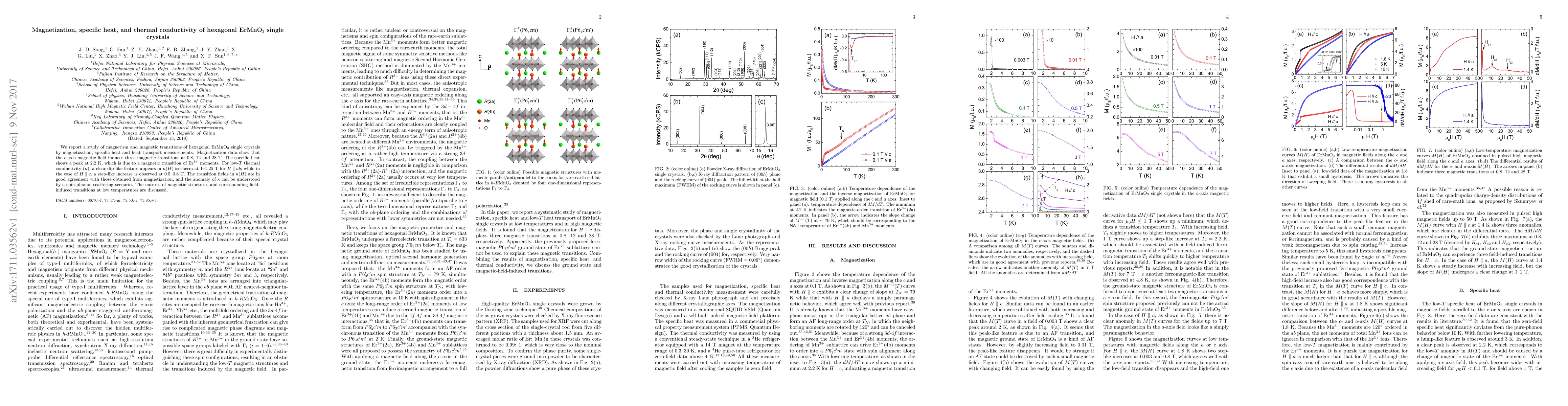 This study investigates the magnetic properties of hexagonal ErMnO$_3$ single crystals, revealing three magnetic transitions under $c$-axis magnetic fields and a peak in specific heat at 2.2 K due to Er$^{3+}$ moments. Thermal conductivity anomalies correlate with magnetization data, suggesting spin-phonon interactions.