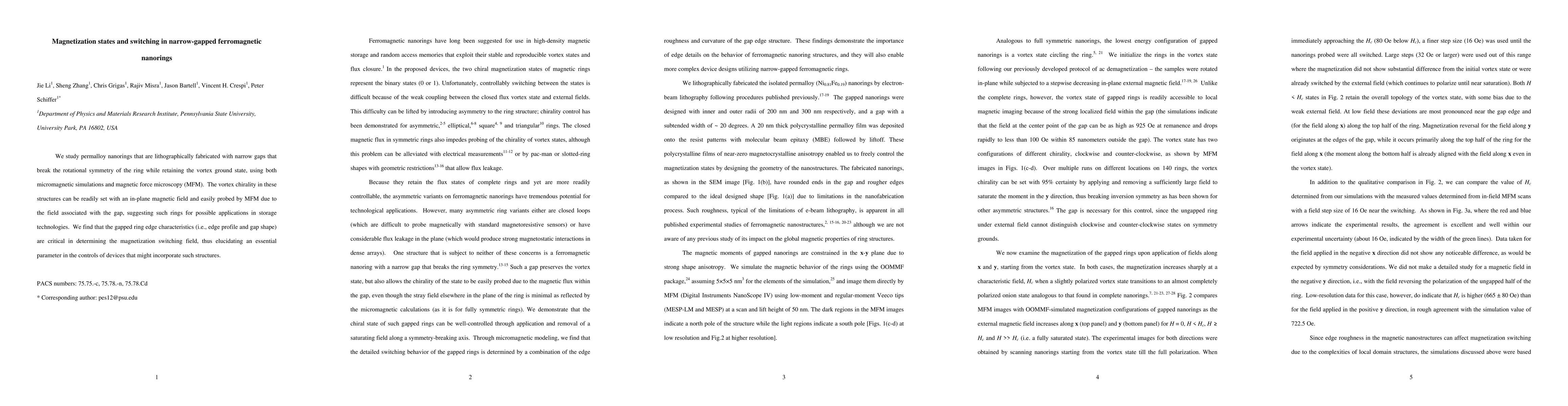 We study permalloy nanorings that are lithographically fabricated with narrow gaps that break the rotational symmetry of the ring while retaining the vortex ground state, using both micromagnetic simulations and magnetic force microscopy (MFM). The vortex chirality in these structures can be readily set with an in-plane magnetic field and easily probed by MFM due to the field associated with the gap, suggesting such rings for possible applications in storage technologies. We find that the gapped ring edge characteristics (i.e., edge profile and gap shape) are critical in determining the magnetization switching field, thus elucidating an essential parameter in the controls of devices that might incorporate such structures.