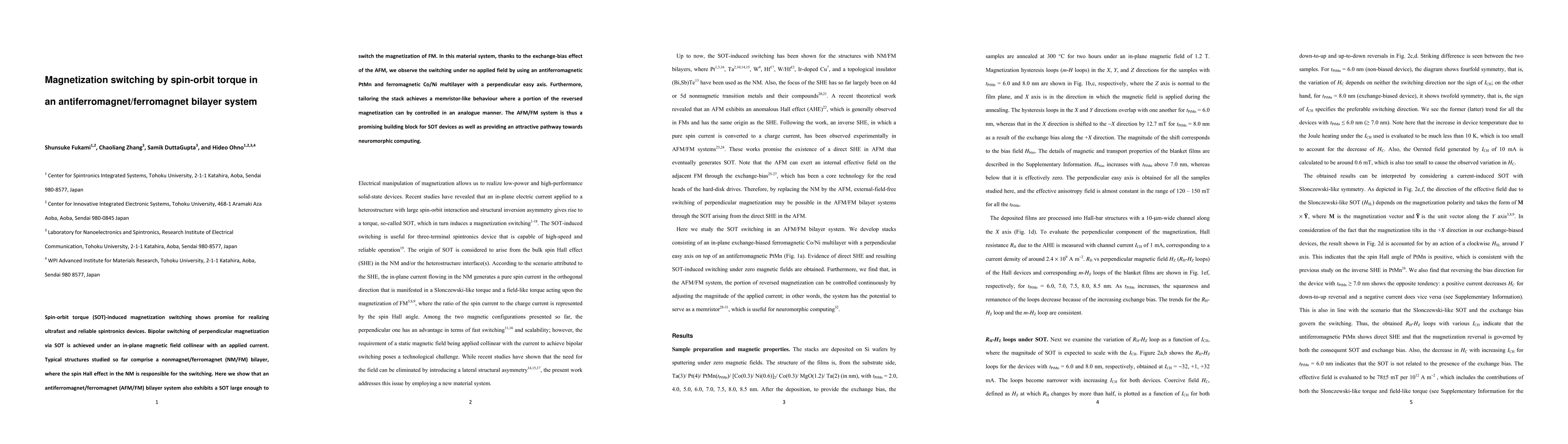 This study demonstrates that spin-orbit torque (SOT) can switch the magnetization of a ferromagnetic layer in an antiferromagnet/ferromagnet bilayer system, facilitated by the exchange-bias effect, without requiring an external magnetic field. This setup also exhibits memristor-like behavior, making it a promising candidate for spintronics and neuromorphic computing applications.