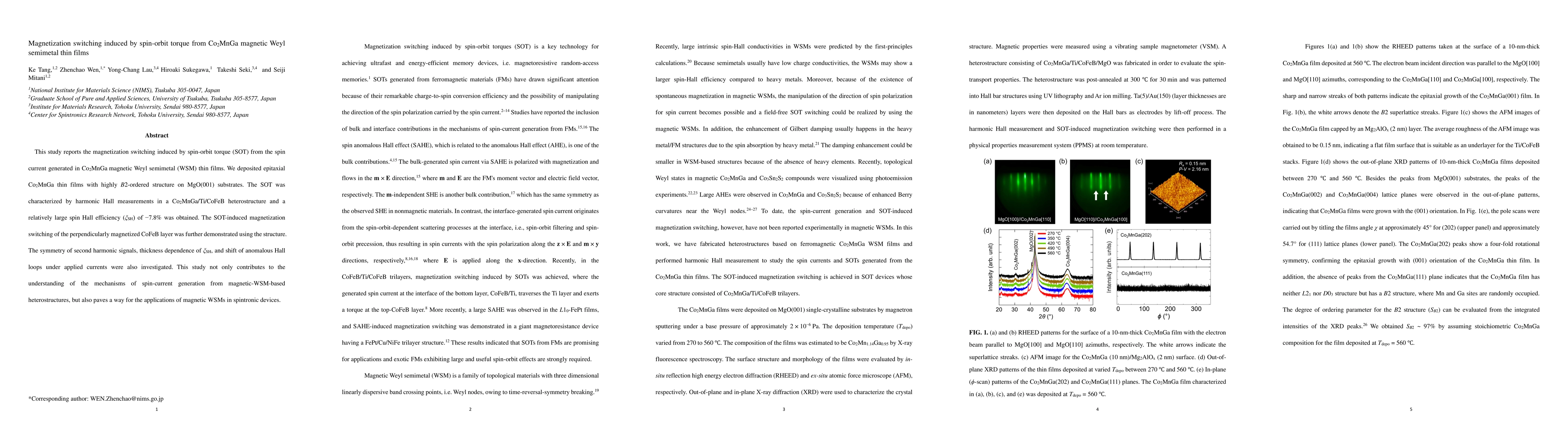 This study demonstrates magnetization switching in Co2MnGa magnetic Weyl semimetal thin films induced by spin-orbit torque from spin currents, achieving a significant spin Hall efficiency of -7.8%. It explores the mechanisms of spin-current generation and its potential for spintronic applications.