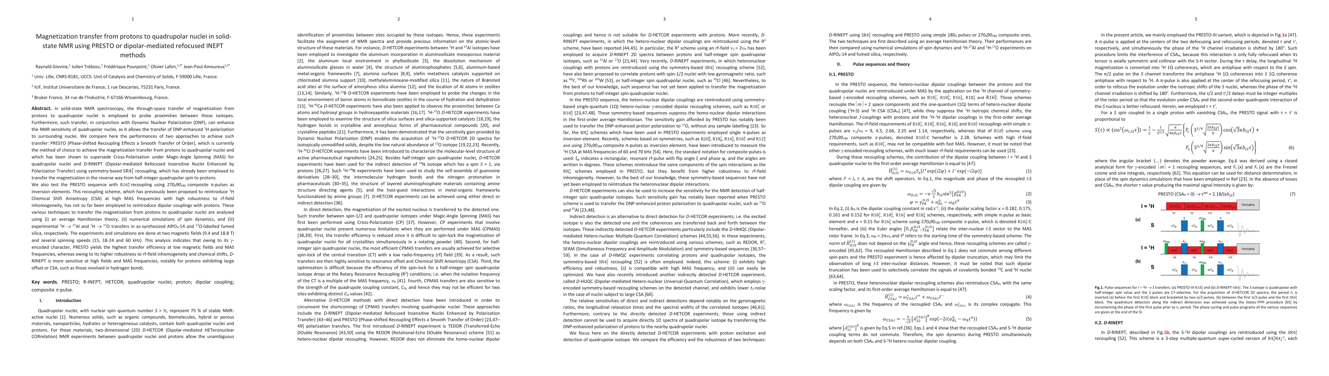 This paper compares the efficiency of PRESTO and D-RINEPT methods for transferring magnetization from protons to quadrupolar nuclei in solid-state NMR, analyzing their performance through theoretical, simulation, and experimental approaches at different magnetic fields and spinning speeds. PRESTO shows higher efficiency at low fields, while D-RINEPT is more effective at high fields, especially for protons with large offsets or chemical shifts.