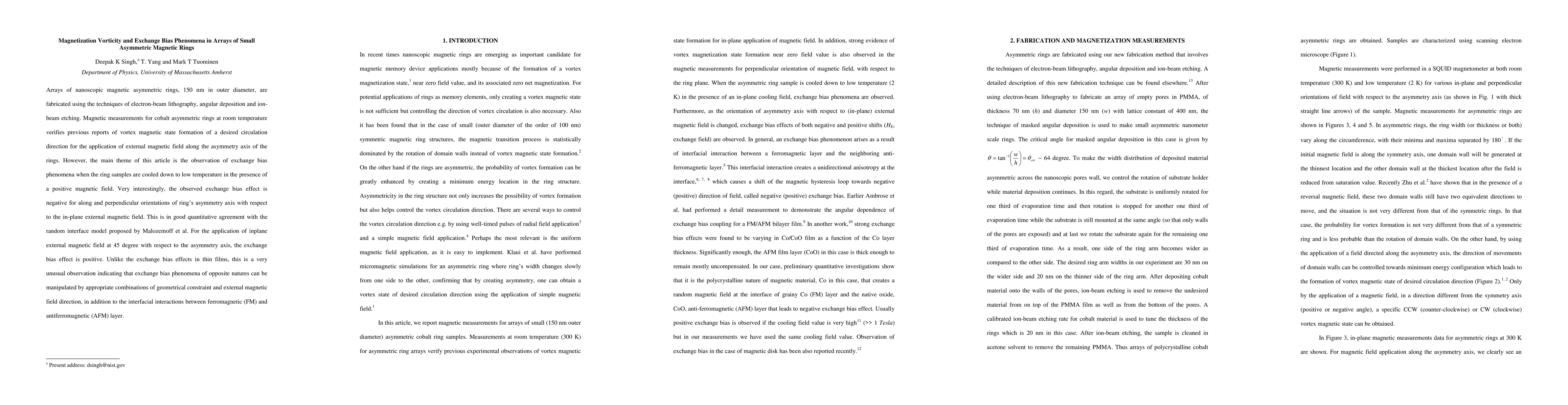 This research presents arrays of 150 nm cobalt rings, fabricated via electron-beam lithography and ion-beam etching, exhibiting vortex magnetic states. Uniquely, it observes negative exchange bias at room temperature in the presence of positive magnetic fields, aligning with Malozemoff's random interface model. The bias nature flips to positive for 45-degree applied fields, demonstrating that geometrical constraints and field direction can manipulate exchange bias phenomena, challenging conventional thin film understanding.