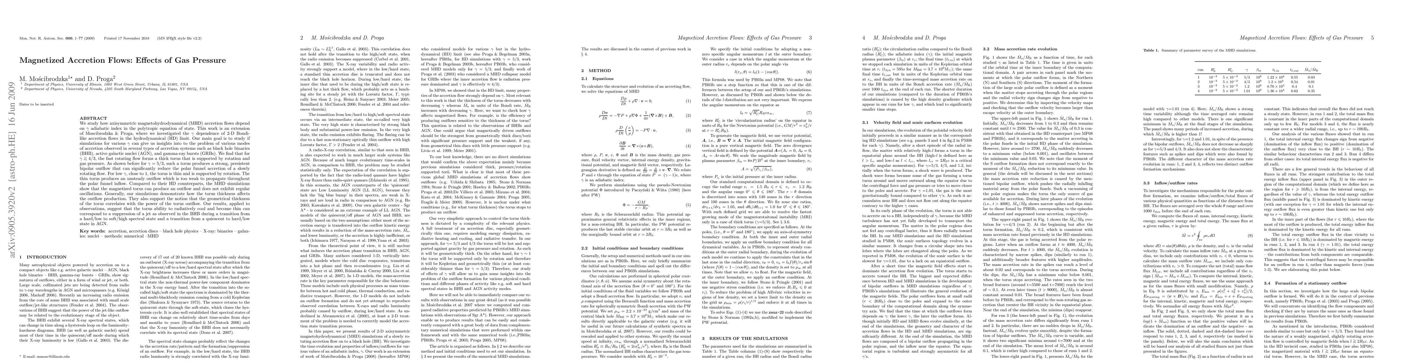 We study how axisymmetric magnetohydrodynamical (MHD) accretion flows depend on gamma adiabatic index in the polytropic equation of state. This work is an extension of Moscibrodzka & Proga (2008), where we investigated the gamma dependence of 2-D Bondi-like accretion flows in the hydrodynamical (HD) limit. Our main goal is to study if simulations for various gamma can give us insights into to the problem of various modes of accretion observed in several types of accretion systems such as black hole binaries (BHB), active galactic nuclei (AGN), and gamma-ray bursts (GRBs). We find that for gamma >~ 4/3, the fast rotating flow forms a thick torus that is supported by rotation and gas pressure. As shown before for gamma=5/3, such a torus produces a strong, persistent bipolar outflow that can significantly reduce the polar funnel accretion of a slowly rotating flow. For low gamma, close to 1, the torus is thin and is supported by rotation. The thin torus produces an unsteady outflow which is too weak to propagate throughout the polar funnel inflow. Compared to their HD counterparts, the MHD simulations show that the magnetized torus can produce an outflow and does not exhibit regular oscillations. Generally, our simulations demonstrate how the torus thickness affects the outflow production. They also support the notion that the geometrical thickness of the torus correlates with the power of the torus outflow. Our results, applied to observations, suggest that the torus ability to radiatively cool and become thin can correspond to a suppression of a jet as observed in the BHB during a transition from a hard/low to soft/high spectral state and a transition from a quiescent to hard/low state in AGN.