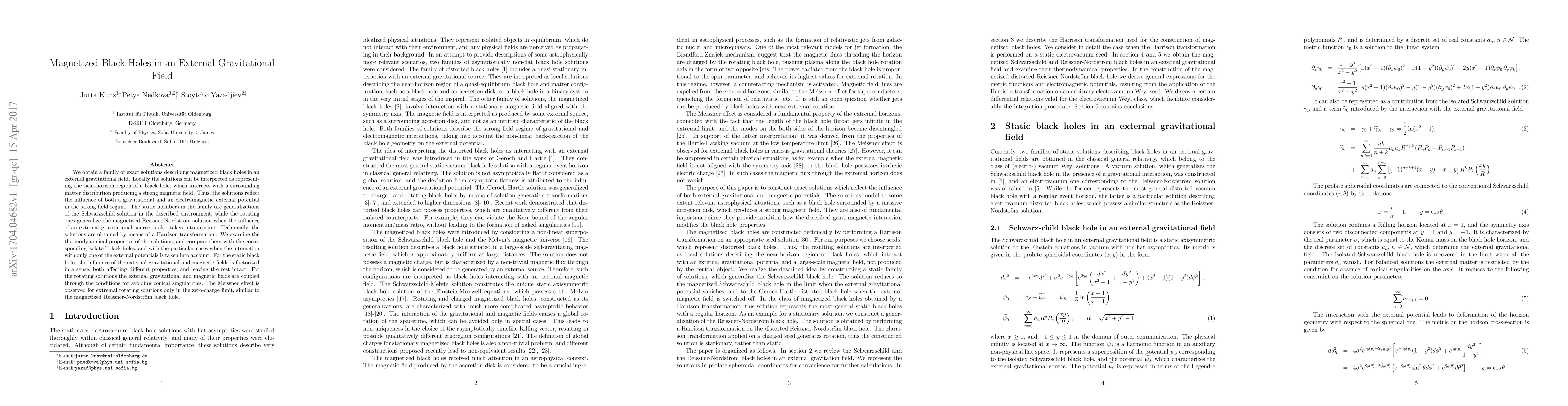This paper presents a family of exact solutions for magnetized black holes in an external gravitational field, exploring their thermodynamic properties and implications, including the Meissner effect observed in certain rotating solutions.