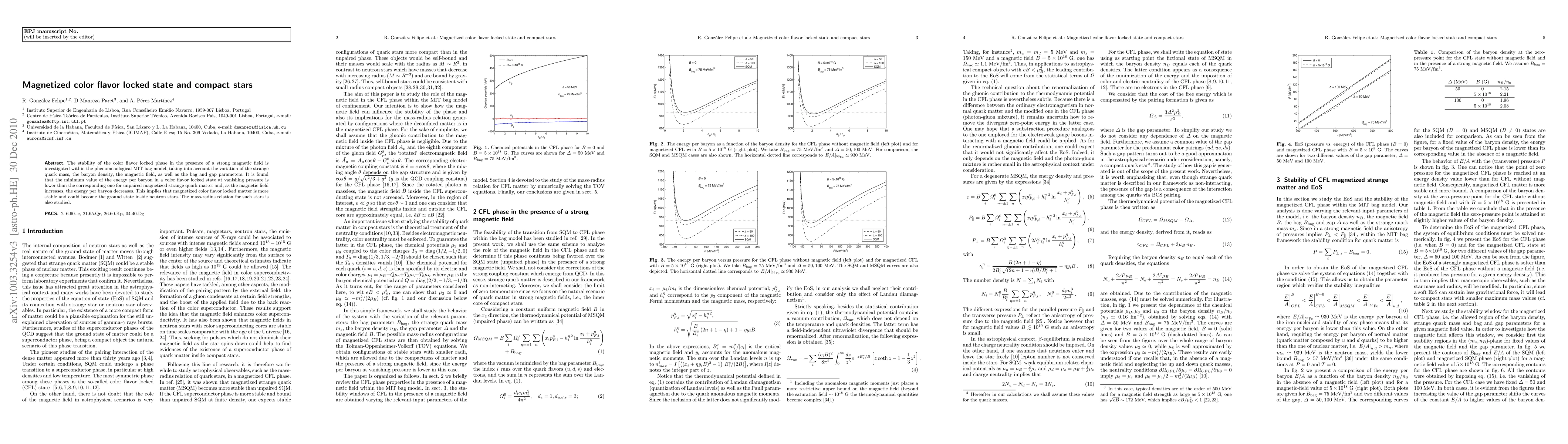 The study investigates the stability of the color flavor locked (CFL) phase in the presence of a strong magnetic field within the phenomenological MIT bag model, considering variations in strange quark mass, baryon density, magnetic field, bag, and gap parameters.