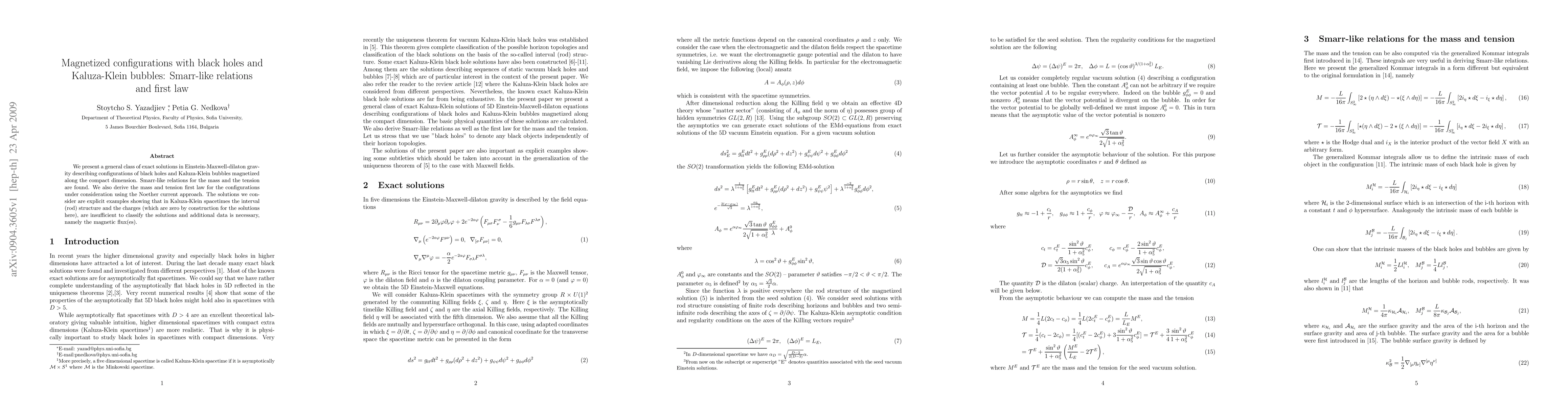 We present a general class of exact solutions in Einstein-Maxwell-dilaton gravity describing configurations of black holes and Kaluza-Klein bubbles magnetized along the compact dimension. Smarr-like relations for the mass and the tension are found. We also derive the mass and tension first law for the configurations under consideration using the Noether current approach. The solutions we consider are explicit examples showing that in Kaluza-Klein spacetimes the interval (rod) structure and the charges (which are zero by construction for the solutions here), are insufficient to classify the solutions and additional data is necessary, namely the magnetic flux(es).