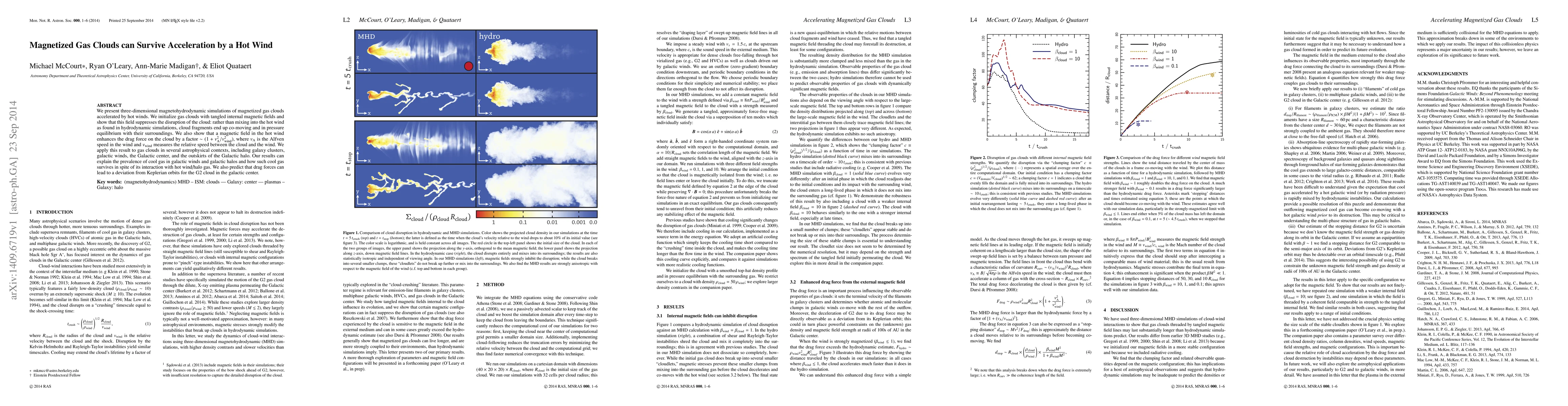 Magnetized gas clouds can survive acceleration by hot winds due to magnetic fields that suppress disruption and enhance drag forces. This helps explain the presence of cool gas in galactic halos and predictions include deviations from Keplerian orbits.