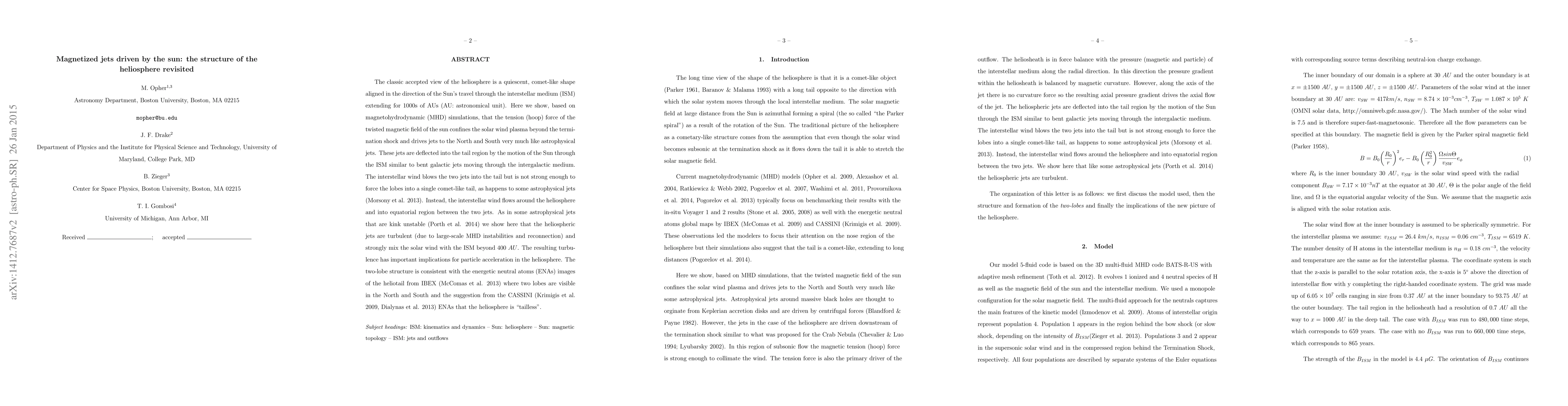 The classic accepted view of the heliosphere is a quiescent, comet-like shape aligned in the direction of the Sun's travel through the interstellar medium (ISM) extending for 1000's of AUs (AU: astronomical unit). Here we show, based on magnetohydrodynamic (MHD) simulations, that the tension (hoop) force of the twisted magnetic field of the sun confines the solar wind plasma beyond the termination shock and drives jets to the North and South very much like astrophysical jets. These jets are deflected into the tail region by the motion of the Sun through the ISM similar to bent galactic jets moving through the intergalactic medium. The interstellar wind blows the two jets into the tail but is not strong enough to force the lobes into a single comet-like tail, as happens to some astrophysical jets (Morsony et al. 2013). Instead, the interstellar wind flows around the heliosphere and into equatorial region between the two jets. As in some astrophysical jets that are kink unstable (Porth et al. 2014) we show here that the heliospheric jets are turbulent (due to large-scale MHD instabilities and reconnection) and strongly mix the solar wind with the ISM beyond 400 AU. The resulting turbulence has important implications for particle acceleration in the heliosphere. The two-lobe structure is consistent with the energetic neutral atoms (ENAs) images of the heliotail from IBEX (McComas et al. 2013) where two lobes are visible in the North and South and the suggestion from the CASSINI (Krimigis et al. 2009, Dialynas et al. 2013) ENAs that the heliosphere is "tailless".