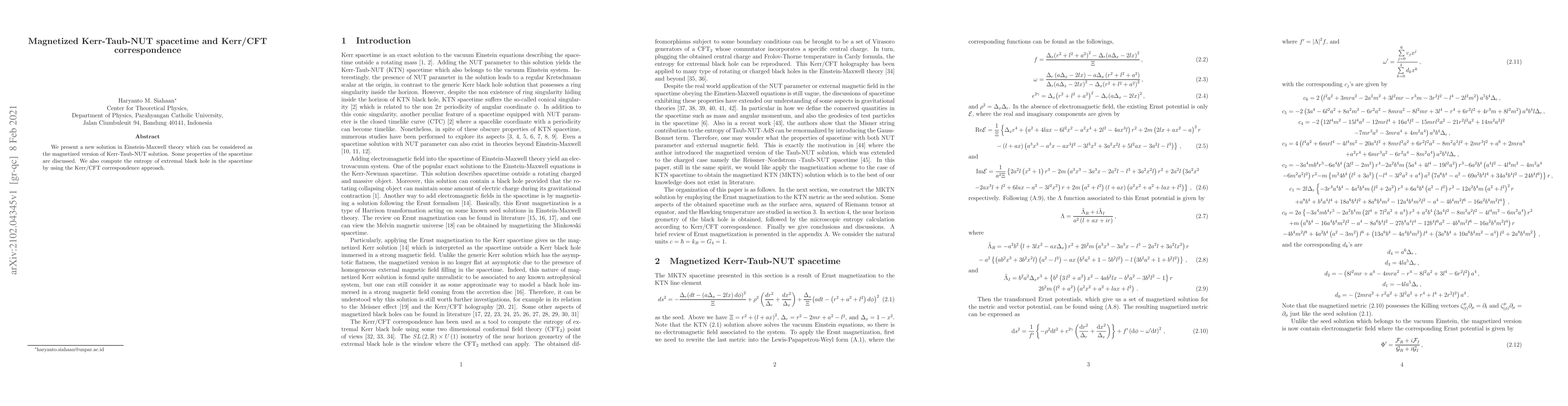 The paper introduces a novel magnetized Kerr-Taub-NUT spacetime solution and demonstrates its consistency with the Kerr/CFT correspondence, providing a microscopic calculation for black hole entropy.