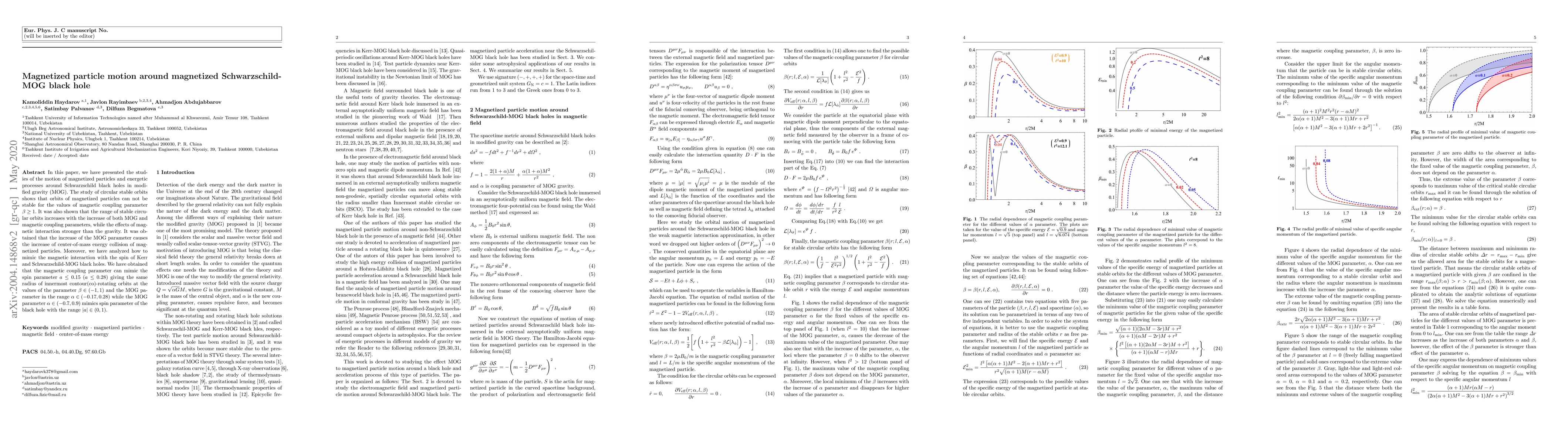 This paper investigates the motion of magnetized particles around Schwarzschild black holes in modified gravity (MOG), finding that stable circular orbits are unattainable for magnetic coupling parameters $\beta \geq 1$. It also shows that the range of stable orbits expands with higher MOG and magnetic coupling parameters, and that increased MOG enhances collision energy. The study concludes that the magnetic coupling parameter can mimic the spin parameter of black holes under certain conditions.