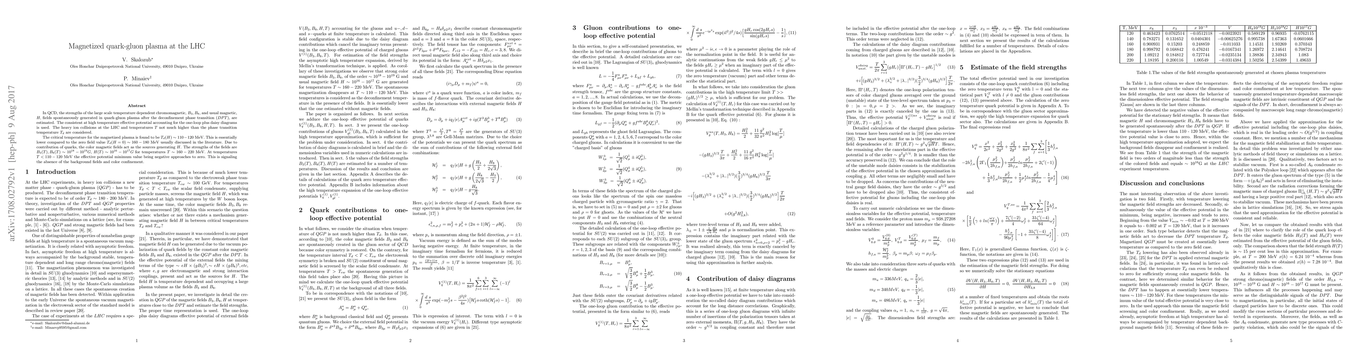 In QCD, the strengths of the large scale temperature dependent chromomagnetic, $B_3, B_8$, and usual magnetic, $H$, fields spontaneously generated in quark-gluon plasma after the deconfinement phase transition (DPT), are estimated. The consistent at high temperature effective potential accounting for the one-loop plus daisy diagrams is used. The heavy ion collisions at the LHC and temperatures T not much higher than the phase transition temperature $T_d$ are considered. The critical temperature for the magnetized plasma is found to be $T_d(H)$ ~ $110 - 120$ MeV. This is essentially lower compared to the zero field value $T_d(H=0)$~ $160-180$ MeV usually discussed in the literature. Due to contribution of quarks, the color magnetic fields act as the sources generating H. The strengths of the fields are $B_3(T), B_8(T) \sim 10^{18} - 10^{19}G, H(T) \sim 10^{16} - 10^{17}G$ for temperatures T ~ 160 - 220 MeV. At temperatures $T < 110 - 120$ MeV the effective potential minimum value being negative approaches to zero. This is signaling the absence of the background fields and color confinement.