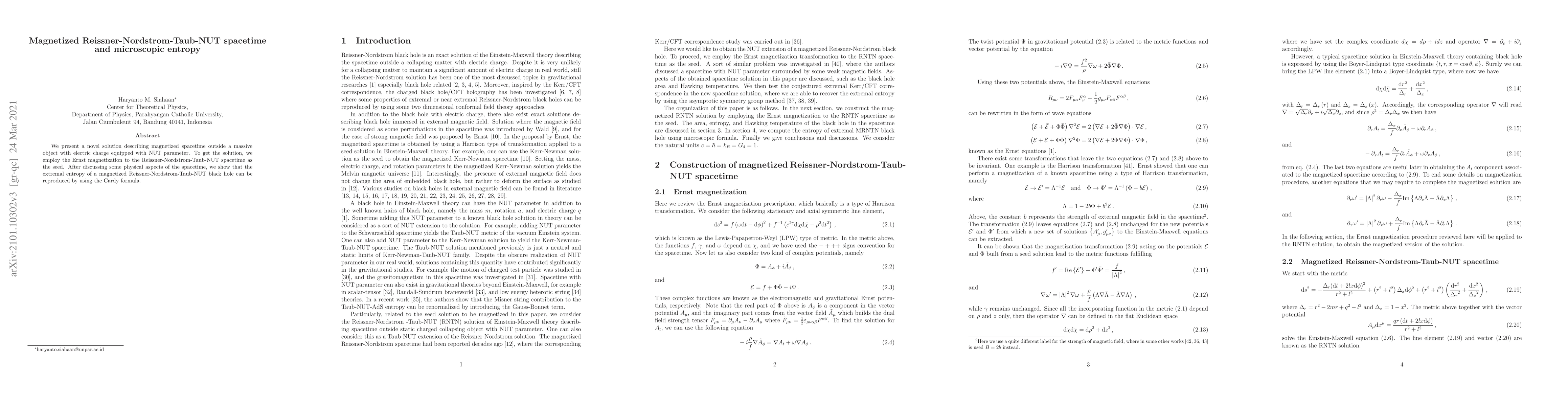 This paper presents a magnetized Reissner-Nordstrom-Taub-NUT spacetime solution derived using Ernst magnetization, and demonstrates that its extremal entropy aligns with the Cardy formula, indicating a microscopic entropy description.
