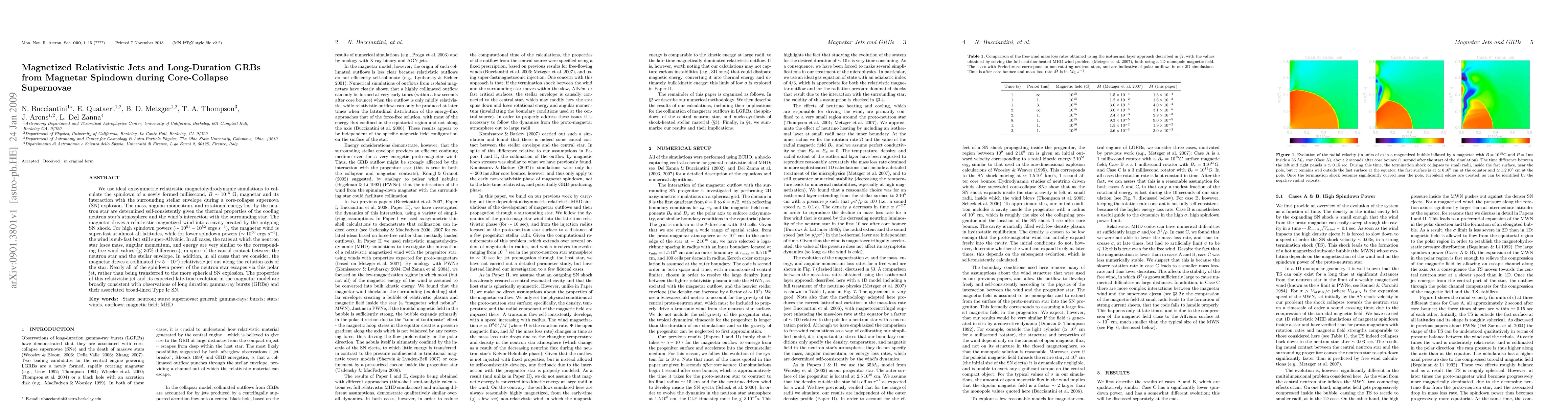 This paper uses relativistic magnetohydrodynamic simulations to study the spindown of a magnetar during a core-collapse supernova, showing that it drives a relativistic jet that aligns with the star's rotation axis. The jet's properties are consistent with long-duration gamma-ray bursts, suggesting a magnetar origin.
