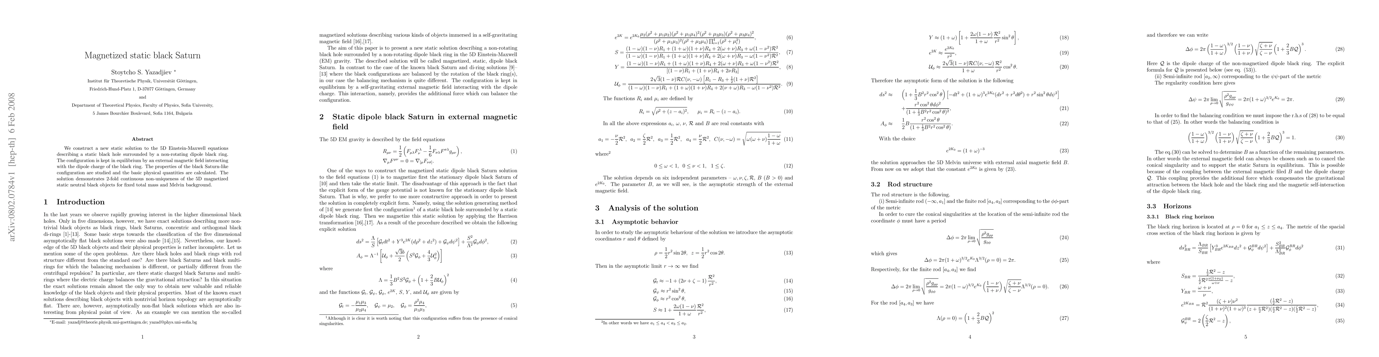 We construct a new static solution to the 5D Einstein-Maxwell equations describing a static black hole surrounded by a non-rotating dipole black ring. The configuration is kept in equilibrium by an external magnetic field interacting with the dipole charge of the black ring. The properties of the black Saturn-like configuration are studied and the basic physical quantities are calculated. The solution demonstrates 2-fold continuous non-uniqueness of the 5D magnetized static neutral black objects for fixed total mass and Melvin background.