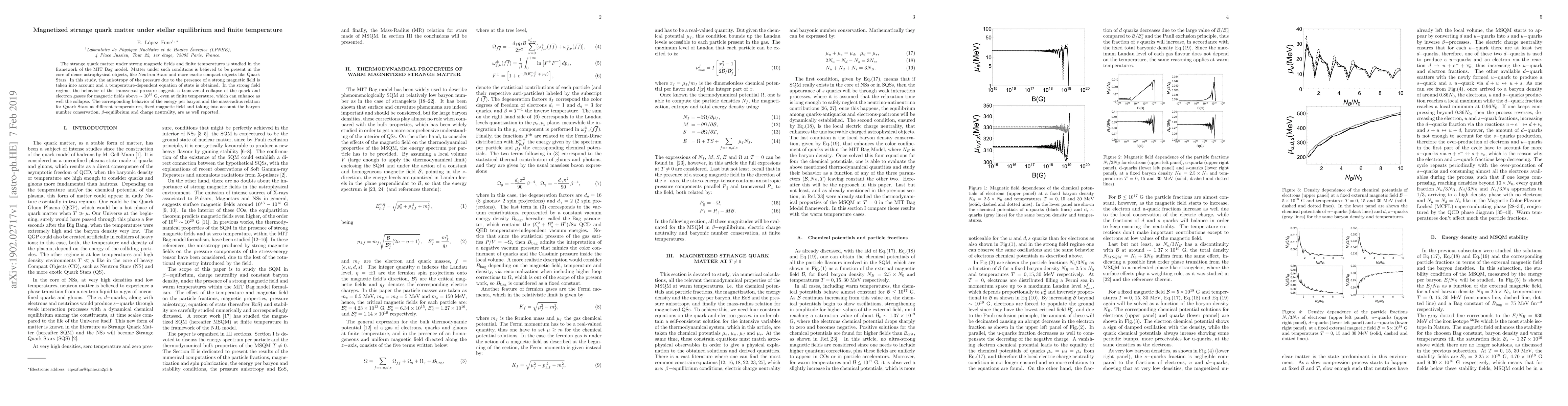 This paper investigates strange quark matter in strong magnetic fields and finite temperatures using the MIT Bag model, focusing on its pressure anisotropy and equation of state. The study finds that high magnetic fields can induce a transversal collapse of quark and electron gases, impacting the mass-radius relation of Quark Stars.