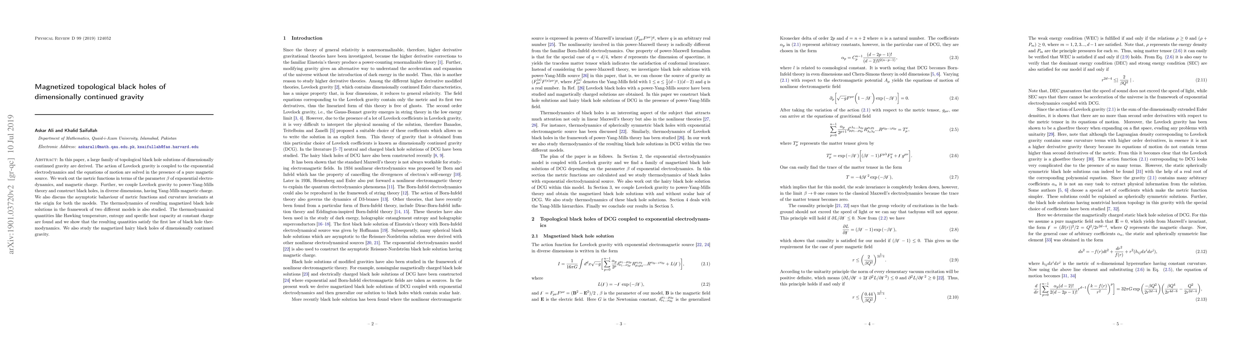 This paper derives topological black hole solutions in dimensionally continued gravity coupled to exponential electrodynamics and power-Yang-Mills theory. It studies the thermodynamics of these magnetized black holes, ensuring compliance with the first law of black hole thermodynamics, and explores their asymptotic behavior and curvature invariants.