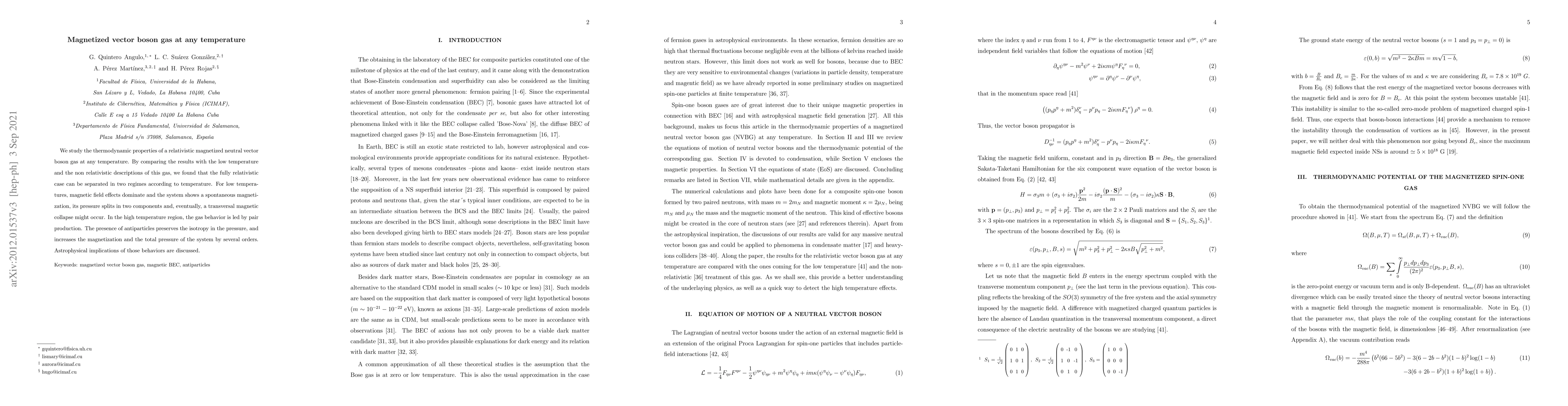 The study examines a magnetized vector boson gas at varying temperatures, revealing distinct low-temperature and high-temperature regimes. At low temperatures, magnetic fields induce spontaneous magnetization and pressure split, possibly leading to collapse. At high temperatures, pair production dominates, maintaining pressure isotropy while enhancing magnetization and total pressure. Astrophysical implications are discussed.