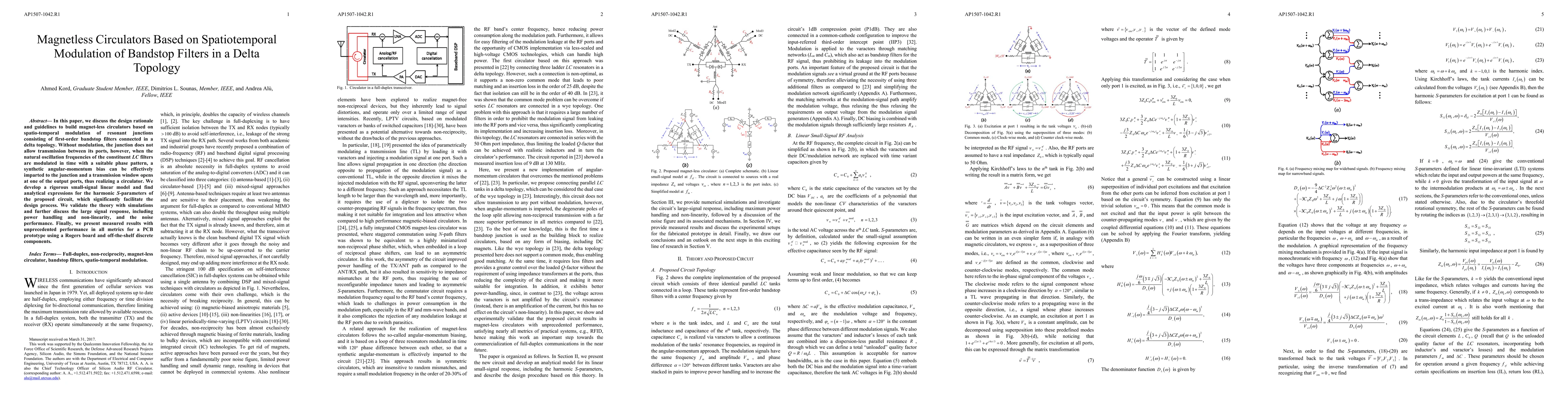 In this paper, we discuss the design rationale and guidelines to build magnet-less circulators based on spatio-temporal modulation of resonant junctions consisting of first-order bandstop filters connected in a delta topology. Without modulation, the junction does not allow transmission between its ports, however, when the natural oscillation frequencies of the constituent LC filters are modulated in time with a suitable phase pattern, a synthetic angular-momentum bias can be effectively imparted to the junction and a transmission window opens at one of the output ports, thus realizing a circulator. We develop a rigorous small-signal linear model and find analytical expressions for the harmonic S-parameters of the proposed circuit, which significantly facilitate the design process. We validate the theory with simulations and further discuss the large signal response, including power handling and non-linearity, and the noise performance. Finally, we present measured results with unprecedented performance in all metrics for a PCB prototype using a Rogers board and off-the-shelf discrete components.