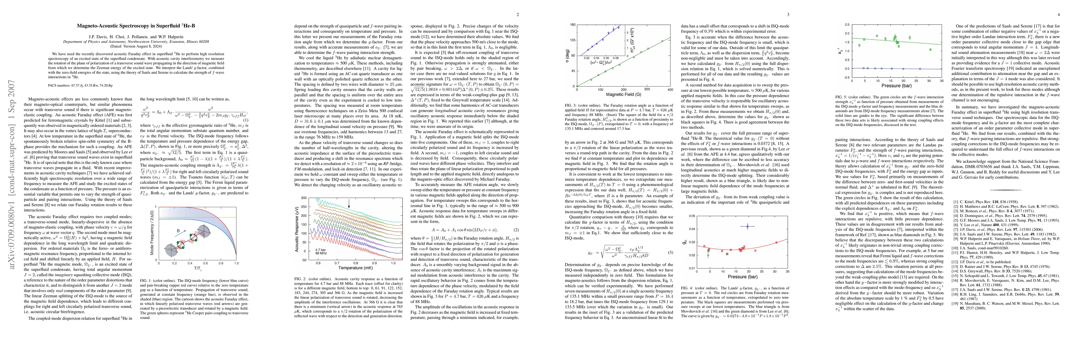 This research employs magneto-acoustic spectroscopy to study the Zeeman energy of an excited state in superfluid 3He-B, utilizing the acoustic Faraday effect and interferometry to determine the Landé g-factor and infer f-wave interaction strengths, thereby enhancing our understanding of the system’s dynamics.