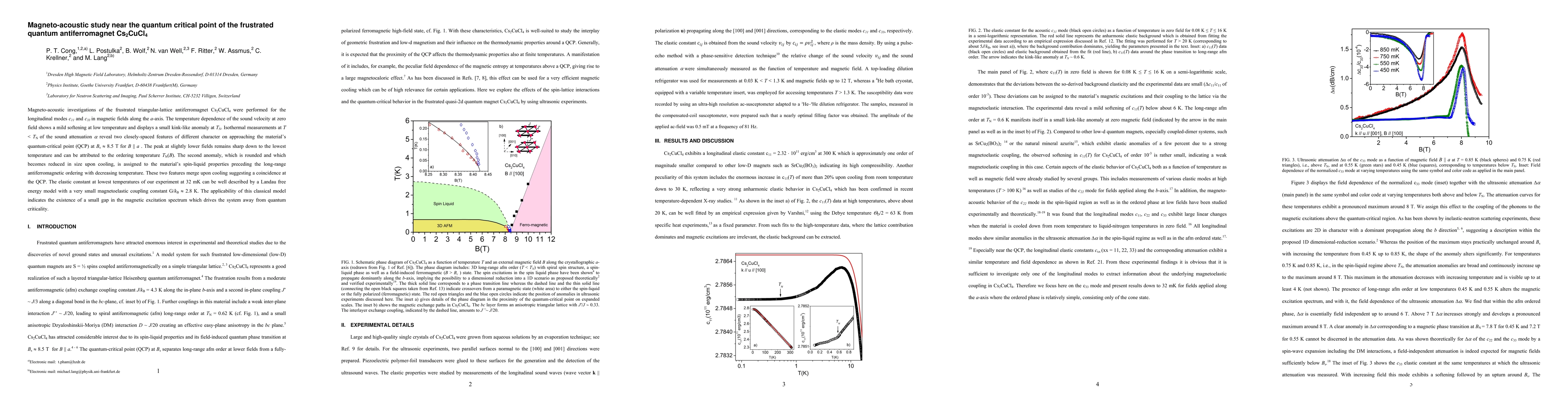 Magneto-acoustic investigations of the frustrated triangular-lattice antiferromagnet Cs2CuCl4 were performed for the longitudinal modes c11 and c33 in magnetic fields along the a-axis. The temperature dependence of the sound velocity at zero field shows a mild softening at low temperature and displays a small kink-like anomaly at TN. Isothermal measurements at T < TN of the sound attenuation reveal two closely-spaced features of different character on approaching the materials quantum-critical point (QCP) around Bs = 8.5 T for B // a. The peak at slightly lower fields remains sharp down to the lowest temperature and can be attributed to the ordering temperature TN(B). The second anomaly which is rounded and which becomes reduced in size upon cooling is assigned to the materials spin-liquid properties preceding the long-range antiferromagnetic ordering. These two features merge upon cooling suggesting a coincidence at the QCP. The elastic constant at lowest temperatures of our experiment at 32 mK can be well described by a Landau free energy model with a very small magnetoelastic coupling constant G/kB = 2.8 K. The applicability of this classical model indicates the existence of a small gap in the magnetic excitation spectrum which drives the system away from quantum criticality.