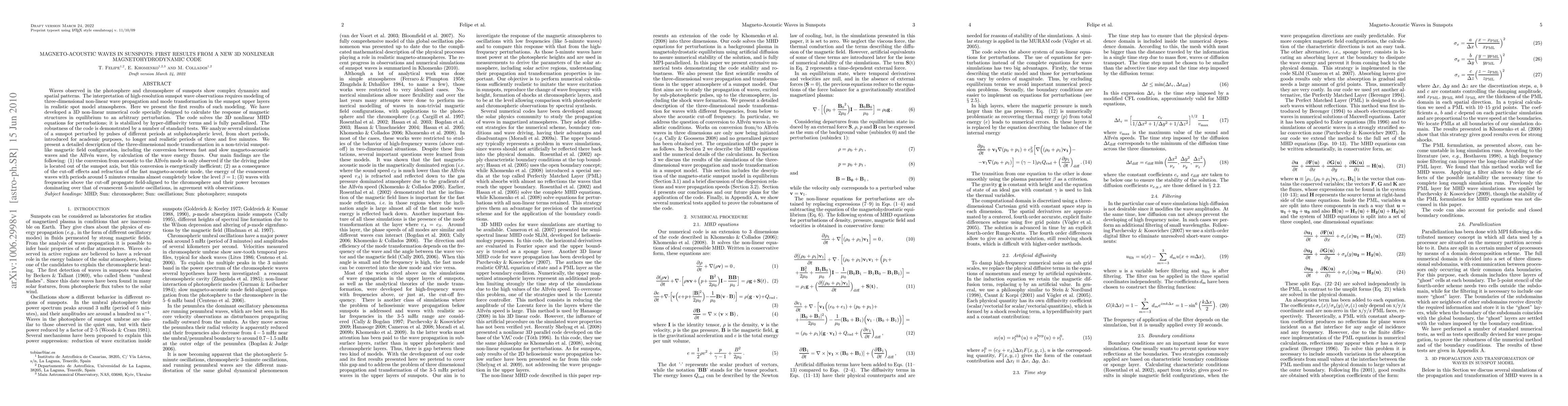 This paper investigates magneto-acoustic waves in sunspots using a new 3D nonlinear magnetohydrodynamic code, revealing complex wave dynamics and mode transformations. Key findings include inefficient conversion from acoustic to Alfv\'en mode and dominance of field-aligned waves with frequencies above the cut-off, aligning with observational data.