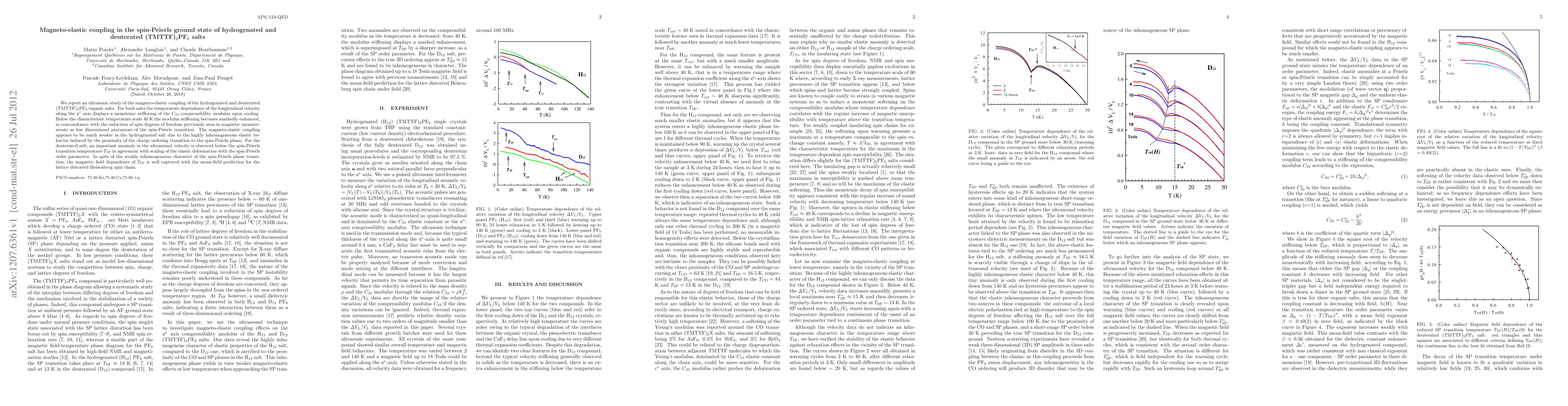 This research investigates the magneto-elastic coupling in hydrogenated and deuterated (TMTTF)$_2$PF$_6$ salts, finding marked stiffness enhancement below 40 K, indicative of the spin-Peierls transition. The deuterated salt exhibits significant anomalies in ultrasound velocity, aligning with the spin-Peierls order parameter, while the hydrogenated salt shows weaker coupling due to charge ordering transition effects.
