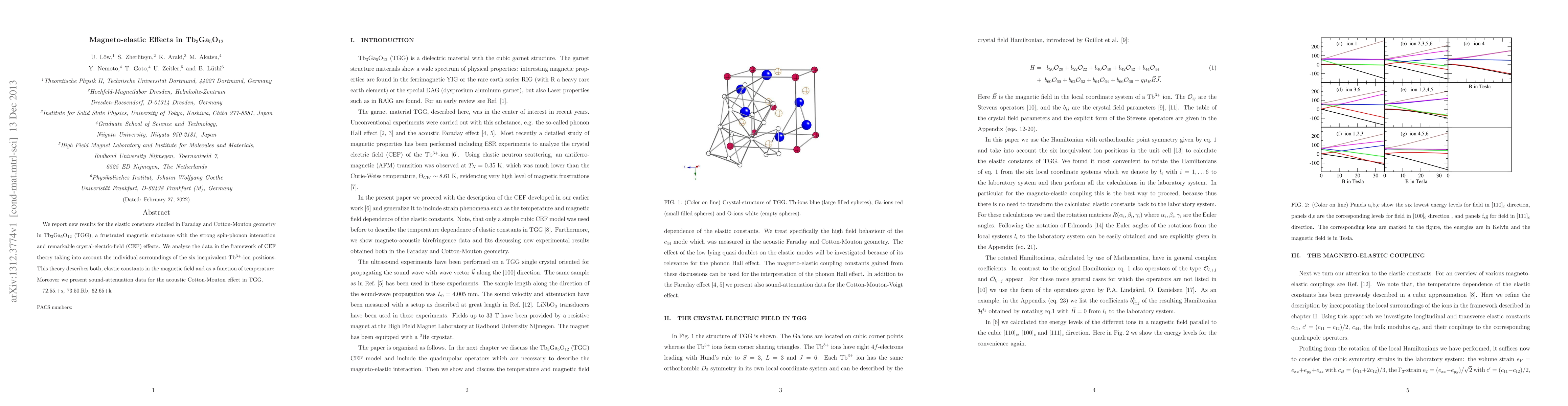 We report new results for the elastic constants studied in Faraday and Cotton-Mouton geometry in Tb$_3$Ga$_5$O$_{12}$ (TGG), a frustrated magnetic substance with strong spin-phonon interaction and remarkable crystal-electric-field (CEF) effects. We analyze the data in the framework of CEF theory taking into account the individual surroundings of the six inequivalent Tb$^{3+}$-ion positions. This theory describes both, elastic constants in the magnetic field and as a function of temperature. Moreover we present sound-attenuation data for the acoustic Cotton-Mouton effect in TGG.