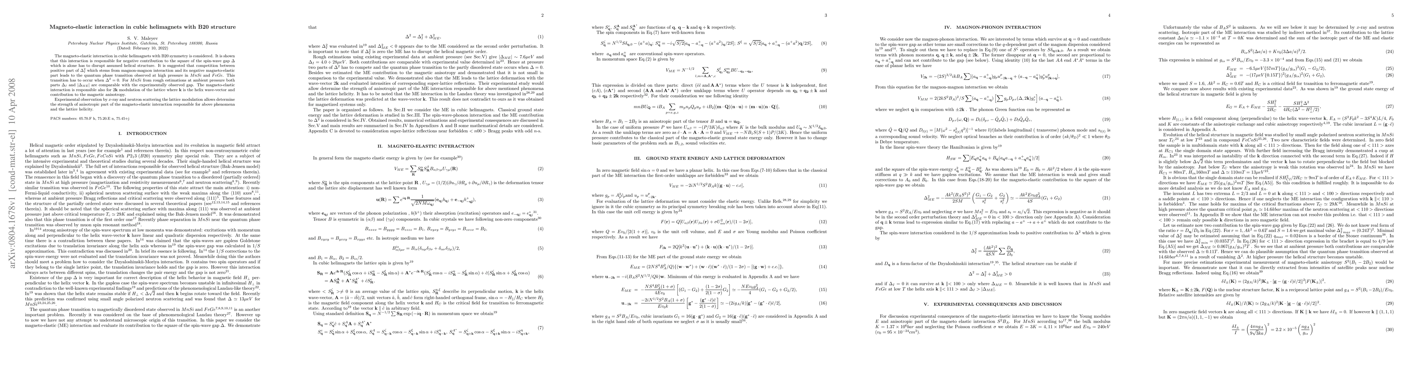 The magneto-elastic interaction in cubic helimagnets with B20 symmetry is considered. It is shown that this interaction is responsible for negative contribution to the square of the spin-wave gap $\Delta$ which is alone has to disrupt assumed helical structure. It is suggested that competition between positive part of $\Delta^2_I$ which stems from magnon-magnon interaction and its negative magneto-elastic part leads to the quantum phase transition observed at high pressure in $Mn Si$ and $Fe Ge$. This transition has to occur when $\Delta^2=0$. For $Mn Si$ from rough estimations at ambient pressure both parts $\Delta_I$ and $|\Delta_{ME}|$ are comparable with the experimentally observed gap. The magneto-elastic interaction is responsible also for $2\m k$ modulation of the lattice where $\m k$ is the helix wave-vector and contribution to the magnetic anisotropy. Experimental observation by $x$-ray and neutron scattering the lattice modulation allows determine the strength of anisotropic part of the magneto-elastic interaction responsible for above phenomena and the lattice helicity.