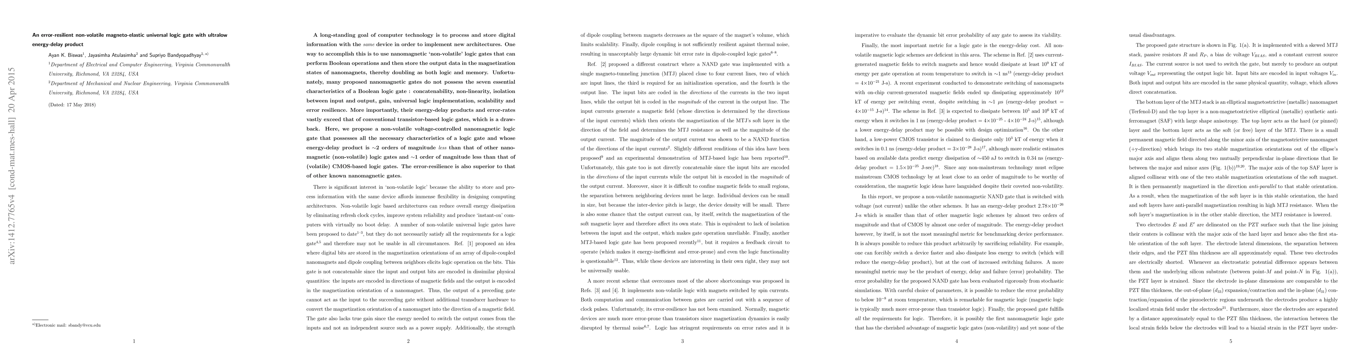 This paper proposes a novel non-volatile magneto-elastic universal logic gate that meets all essential characteristics of Boolean logic gates, including scalability and error resilience. It achieves an ultra-low energy-delay product, significantly outperforming both nanomagnetic and CMOS-based logic gates.