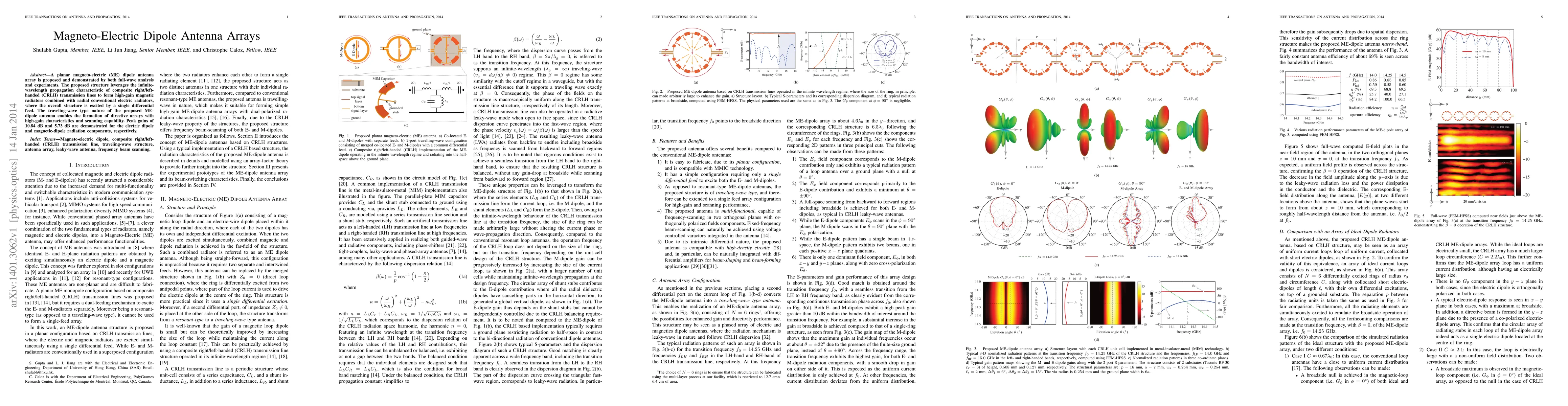 The paper introduces a planar magneto-electric dipole antenna array based on CRLH transmission lines, exploiting their infinite wavelength propagation characteristics to form high-gain magnetic radiators combined with conventional electric radiators.