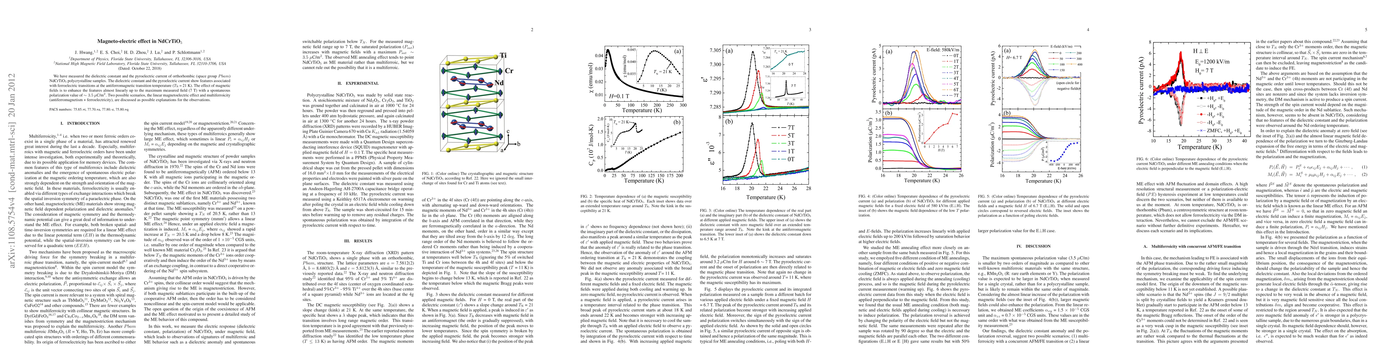 We have measured the dielectric constant and the pyroelectric current of orthorhombic (space group $Pbam$) NdCrTiO$_5$ polycrystalline samples. The dielectric constant and the pyroelectric current show features associated with ferroelectric transitions at the antiferromagnetic transition temperature ($T_{\text{N}}$ = 21 K). The effect of magnetic fields is to enhance the features almost linearly up to the maximum measured field (7 T) with a spontaneous polarization value of $\sim 3.5 \mu$C/m$^2$. Two possible scenarios, the linear magnetoelectric effect and multiferroicity (antiferromagnetism + ferroelectricity), are discussed as possible explanations for the observations.