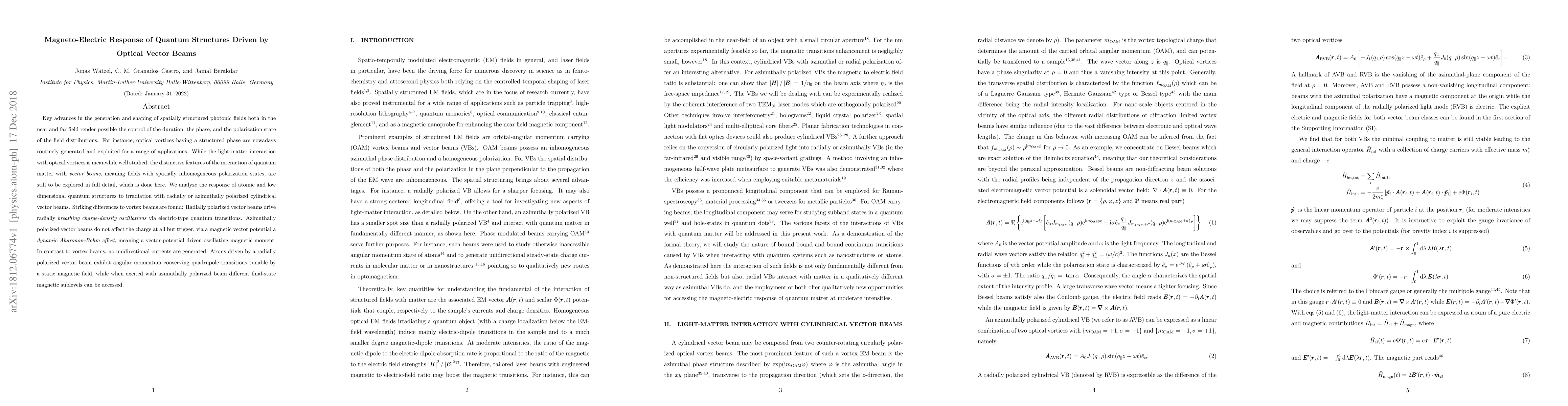 This research explores how quantum structures respond to optical vector beams with spatially inhomogeneous polarization states. Radially polarized beams induce charge-density oscillations, while azimuthally polarized beams trigger magnetic effects without affecting charge, leading to unique quantum transitions and magnetic moment oscillations, distinct from vortex beams' unidirectional currents.