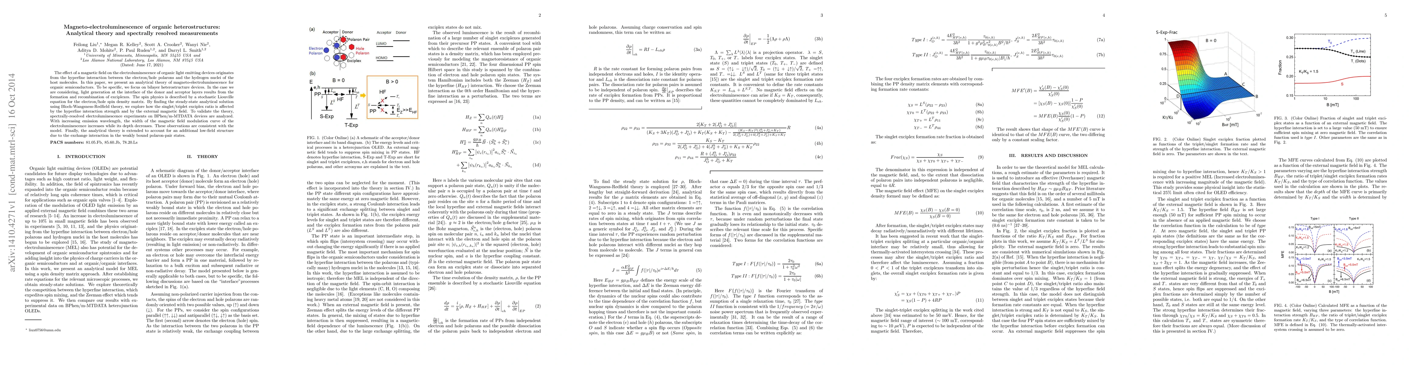 The effect of a magnetic field on the electroluminescence of organic light emitting devices originates from the hyperfine interaction between the electron/hole polarons and the hydrogen nuclei of the host molecules. In this paper, we present an analytical theory of magneto-electroluminescence for organic semiconductors. To be specific, we focus on bilayer heterostructure devices. In the case we are considering, light generation at the interface of the donor and acceptor layers results from the formation and recombination of exciplexes. The spin physics is described by a stochastic Liouville equation for the electron/hole spin density matrix. By finding the steady-state analytical solution using Bloch-Wangsness-Redfield theory, we explore how the singlet/triplet exciplex ratio is affected by the hyperfine interaction strength and by the external magnetic field. To validate the theory, spectrally-resolved electroluminescence experiments on BPhen/m-MTDATA devices are analyzed. With increasing emission wavelength, the width of the magnetic field modulation curve of the electroluminescence increases while its depth decreases. These observations are consistent with the model. Finally, the analytical theory is extended to account for an additional low-field structure due to the exchange interaction in the weakly bound polaron-pair states.