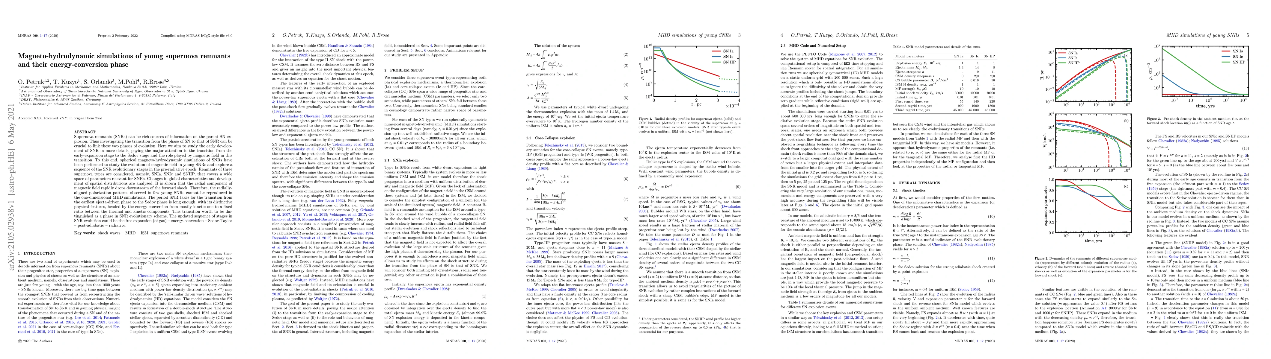 Supernova remnants (SNRs) can be rich sources of information on the parent SN explosion. Thus investigating the transition from the phase of SN to that of SNR can be crucial to link these two phases of evolution. Here we aim to study the early development of SNR in more details, paying the major attention to the transition from the early-expansion stage to the Sedov stage and the role played by magnetic field in this transition. To this end, spherical magneto-hydrodynamic simulations of SNRs have been performed to study the evolution of magnetic field in young SNRs and explore a sequence of the SNR evolutionary stages in the pre-radiative epoch. Remnants of three supernova types are considered, namely, SNIa, SNIc and SNIIP, that covers a wide space of parameters relevant for SNRs. Changes in global characteristics and development of spatial distributions are analysed. It is shown that the radial component of magnetic field rapidly drops downstream of the forward shock. Therefore, the radially-aligned polarization patterns observed in few young SNRs cannot be reproduced in the one-dimensional MHD simulations. The period SNR takes for the transition from the earliest ejecta-driven phase to the Sedov phase is long enough, with its distinctive physical features, headed by the energy conversion from mostly kinetic one to a fixed ratio between the thermal and kinetic components. This transition worth to be distinguished as a phase in SNR evolutionary scheme. The updated sequence of stages in SNR evolution could be the free expansion (of gas) -- energy-conversion -- Sedov-Taylor -- post-adiabatic -- radiative.