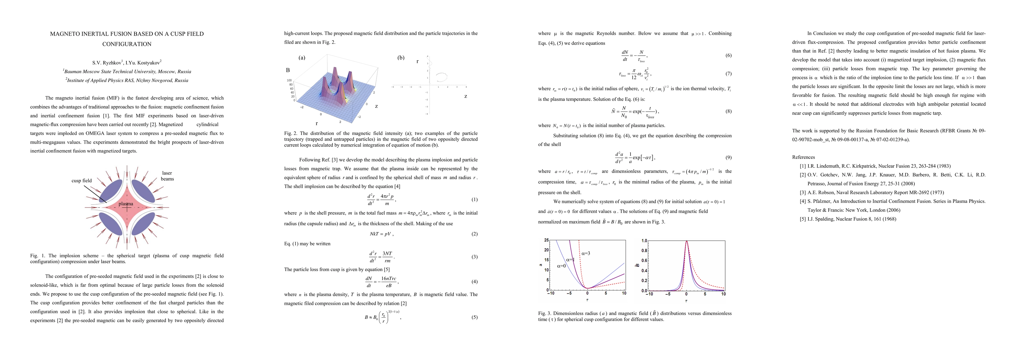 We study the cusp configuration of pre-seeded magnetic field for laser-driven flux-compression. The proposed configuration provides better particle confinement than that in Ref. [O.V. Gotchev et al., Journal of Fusion Energy 27 (2008) 25-31.] thereby leading to better magnetic insulation of hot fusion plasma. We develop the model that takes into account (i) magnetized target implosion, (ii) magnetic flux compression; (iii) particle losses from magnetic trap. The key parameter governing the process is the ratio of the implosion time to the particle loss time.