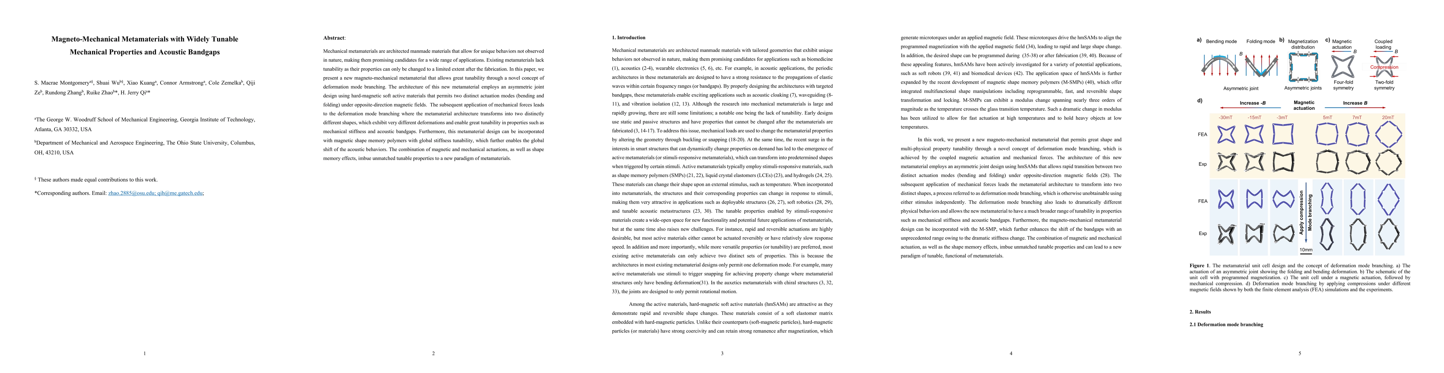 This paper introduces a magneto-mechanical metamaterial with tunable mechanical properties and acoustic bandgaps via deformation mode branching. The asymmetric joint design, utilizing hard-magnetic soft active materials, allows for significant tunability through bending and folding under magnetic fields.