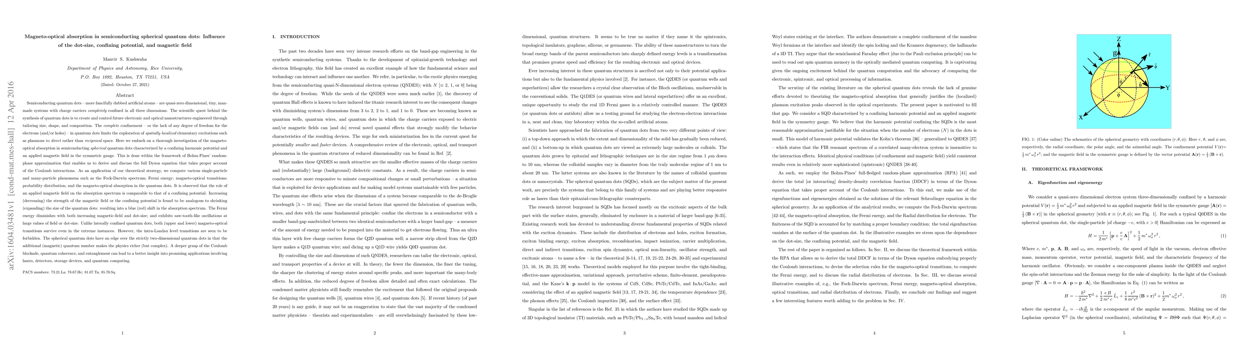 This paper investigates the magneto-optical absorption in semiconducting spherical quantum dots under a confining potential and magnetic field, using Bohm-Pines' random-phase approximation. The study reveals that both magnetic field and confining potential influence the absorption spectrum, with increasing magnetic field or potential mimicking a reduction in dot size, leading to a blue shift in absorption.